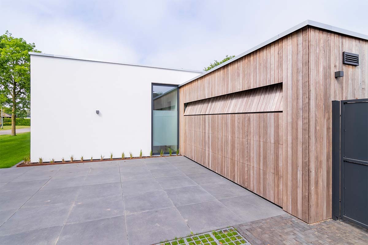 Bekijk dit bijzondere project met twee houten automatische garagedeuren en gevelbekleding >>