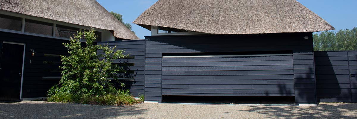 Een houten sectionaaldeur met het gemak van een garagedeur op rails die gemakkelijk open en dicht gaat en de luxe uitstraling van een houten deur heeft.
