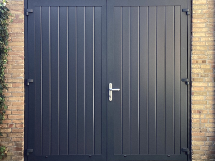 2x Openslaande garagedeuren (staalblauw) perfect geplaatst