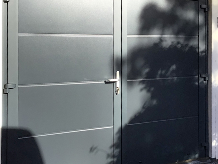 Een dubbele garage is nu voorzien van 2x openslaande garagedeuren in Staalblauw (RAL 5011).