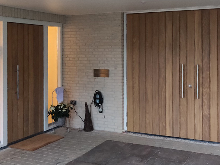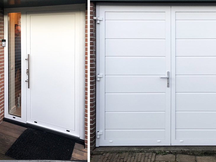De voor- en garagedeuren zijn echt prachtig en van zware kwaliteit. In 1 dag gemonteerd met strakke afwerking (deuren zitten aan de binnenkant in de grondlak, dus dat en de kozijnen nog even zelf afwerken). Niet goedkoop, maar dat is normaal voor dit niveau. Mensen uit de buurt bellen soms aan om te zeggen hoe mooi de deuren zijn!