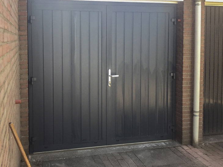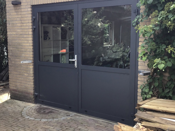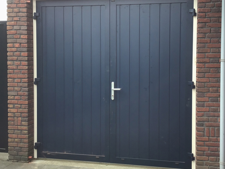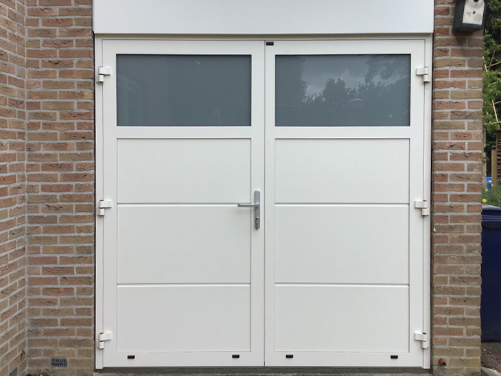 We hebben onze garagedeur laten vervangen door twee openslaande deuren met matglazen raampjes bovenin. Dit geeft enorm veel licht in de garage en de deuren zijn ook bijzonder mooi afgewerkt met degelijk sluitwerk.