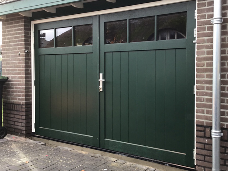 De twee houten garagedeuren zijn naar alle tevredenheid geplaatst.