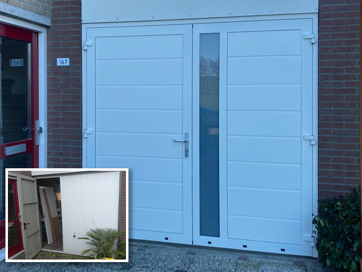 Oude garagedeuren waren aan vervanging toe. Different Doors had een aardig model met verticaal raam naast de deur. Daarom DD gekozen. Niet geweten dat ik er zo blij mee zou zijn. Perfecte service, aardige monteurs en nette afwerking. Wat een verschil met de oude stalen kanteldeur met loopdeur. De garage is omgetoverd tot een stille en geïsoleerde binnenruimte en lijkt vanaf buiten en binnen een stuk netter en ruimer.
