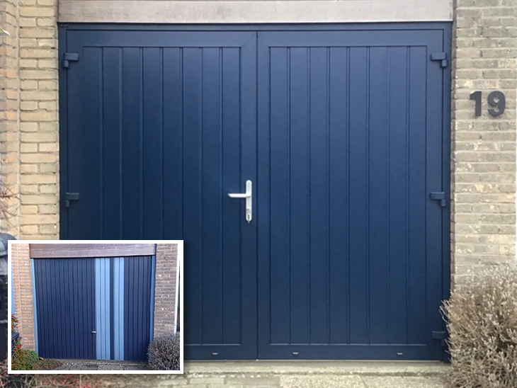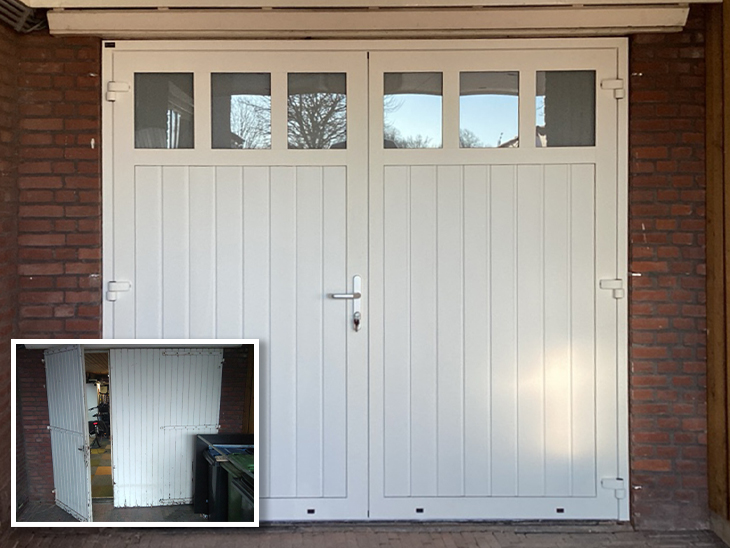 Ongelofelijk wat zo’n garage toegankelijker is geworden nu we de oude stalen loodzware kanteldeur hebben laten vervangen door prachtige nieuwe deuren. Je loopt voor je plezier nu de garage in.