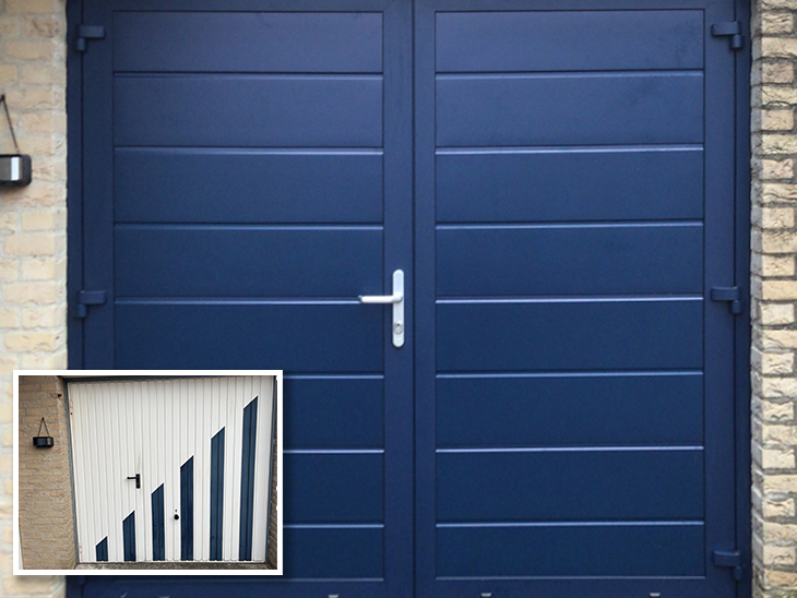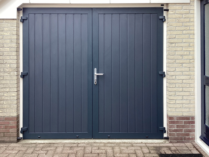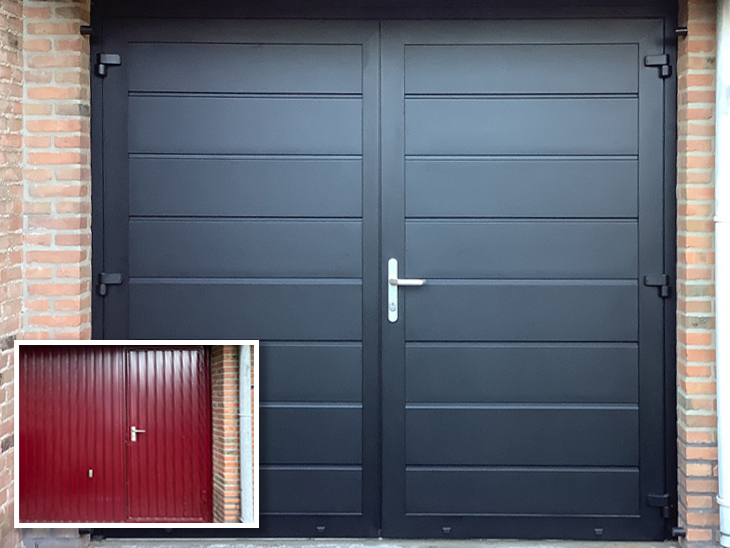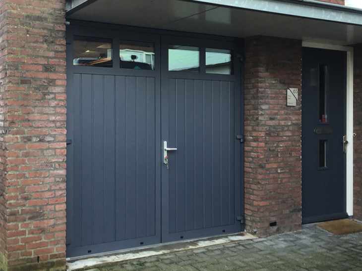 Nieuwe openslaande garagedeuren ter vervanging van stalen garagedeur. Oude deuren verwijderd en afgevoerd, nieuwe deuren netjes gemonteerd en afgewerkt.