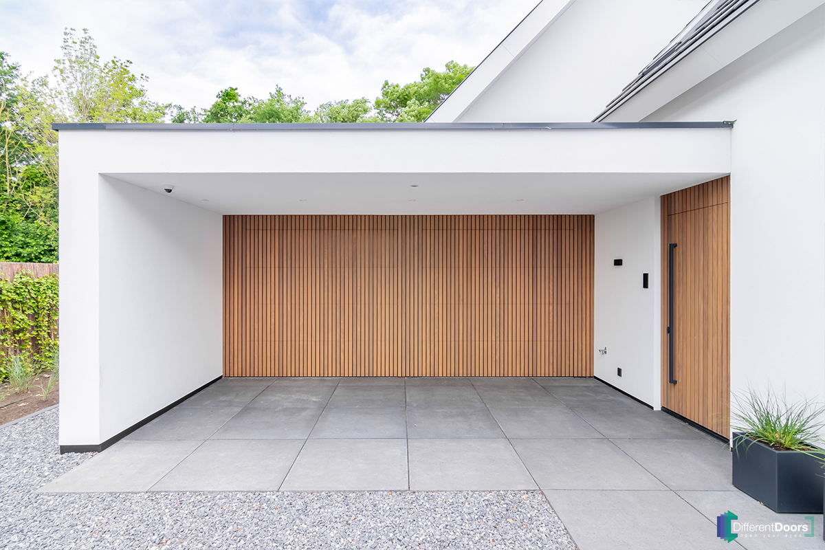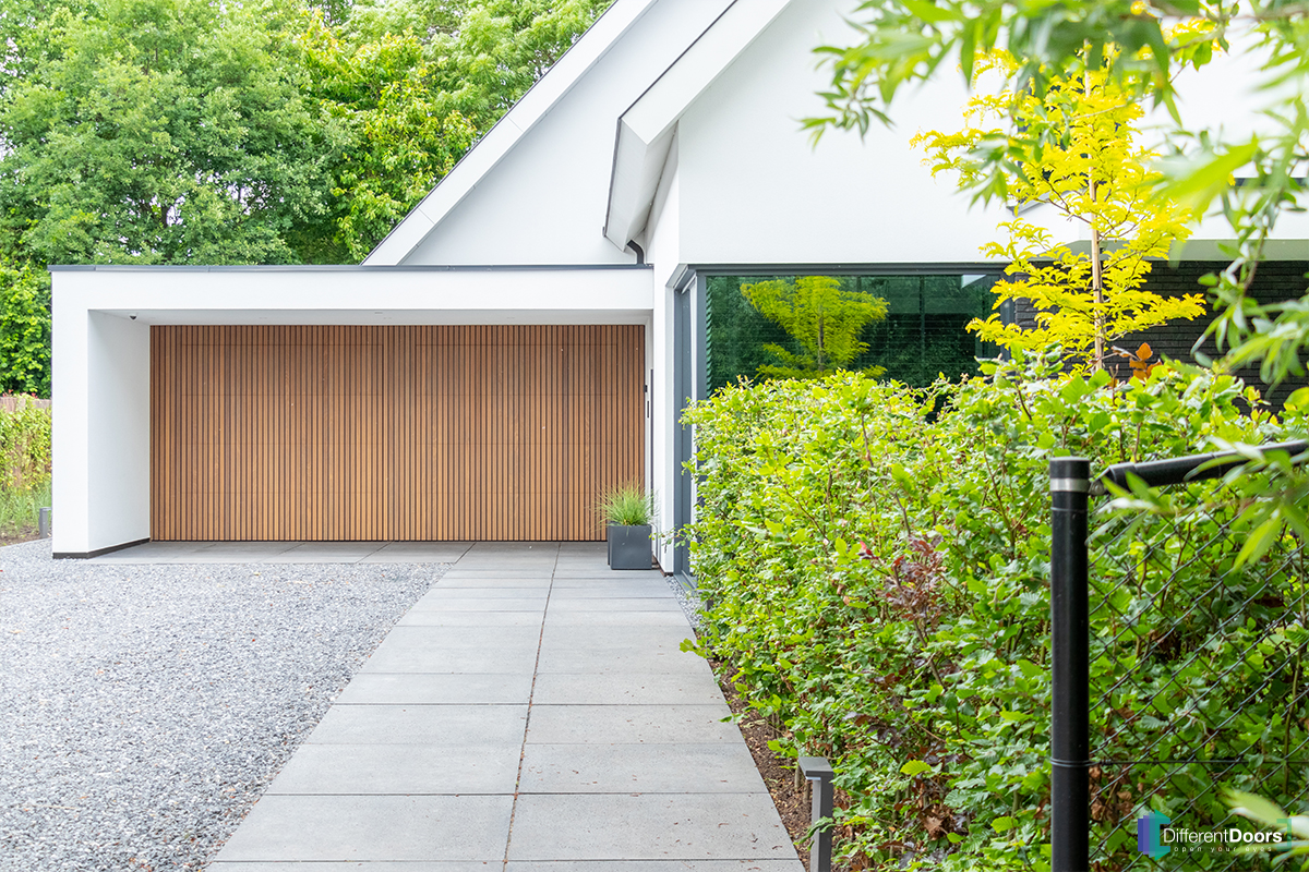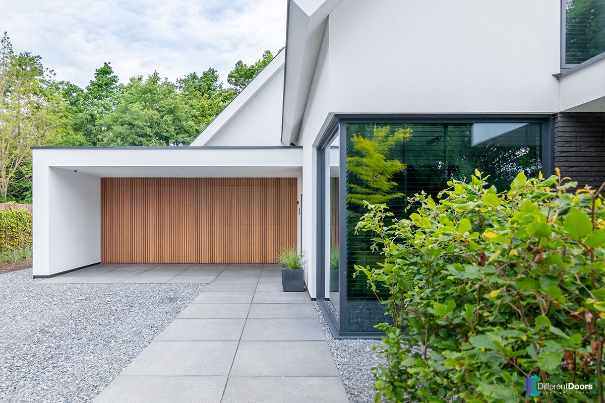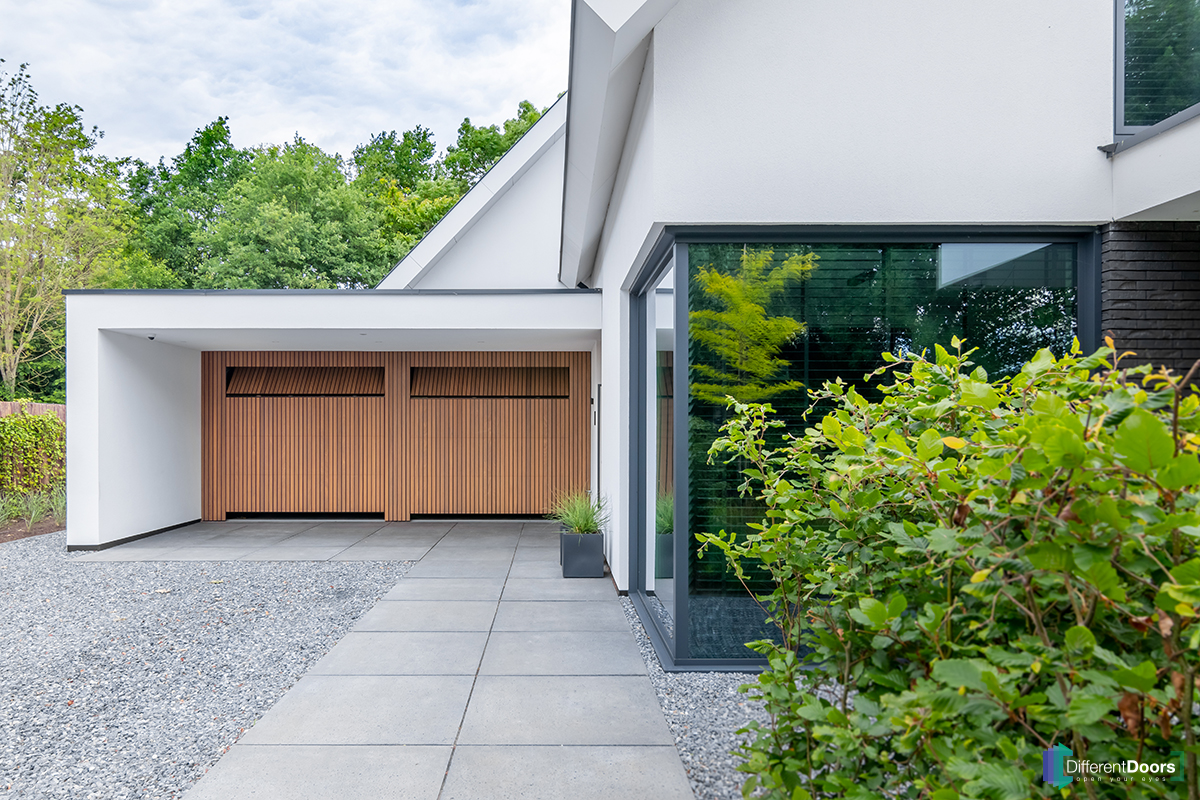 Een van de specialiteiten van Different Doors is het onzichtbaar verwerken van de garagedeuren in de gevel. Dit doen we door de houten latten van de garagedeuren perfect over te laten lopen op de latten van de gevelbekleding. Hierdoor verdwijnen de garagedeuren als het ware in de wand.