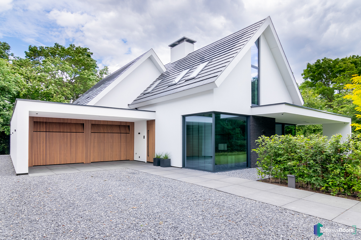 Different Doors heeft twee prachtige houten sectionaaldeuren geplaatst met bijpassende voordeur in dezelfde stijl. De garagedeuren zijn volledig in de gevel geïntegreerd waardoor ze vrijwel onzichtbaar zijn in gesloten stand. De warme uitstraling van het hout steekt mooi af op de verder strak witte woning.