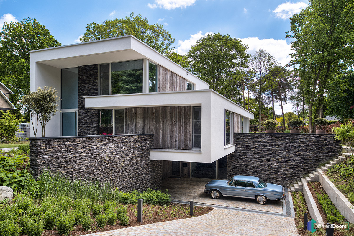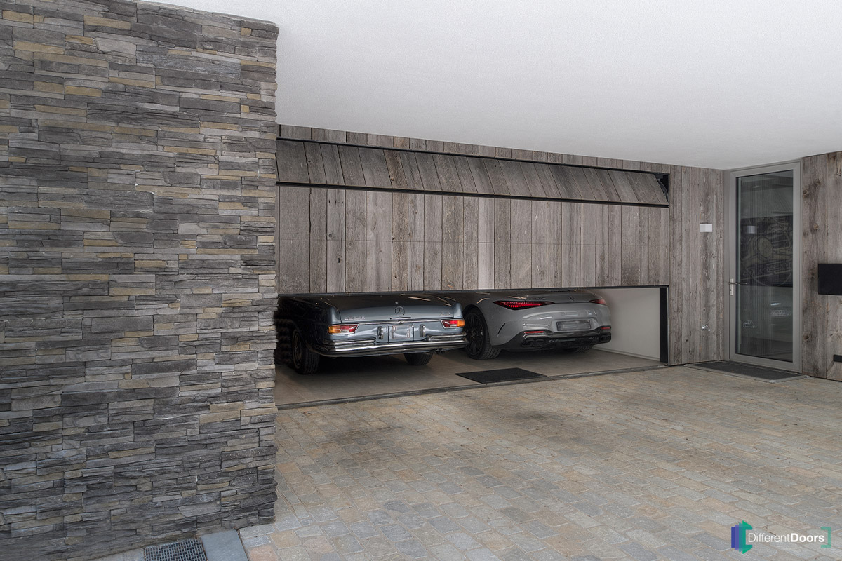 Bij deze indrukwekkende nieuwbouwwoning met strakke lijnen en natuurlijke elementen heeft Different Doors een exclusieve sectionaaldeur geplaatst. De garagedeur is gelijk met de gevel gemonteerd en bekleed met authentiek Barnwood, waardoor deze naadloos opgaat in de architectuur van de woning.