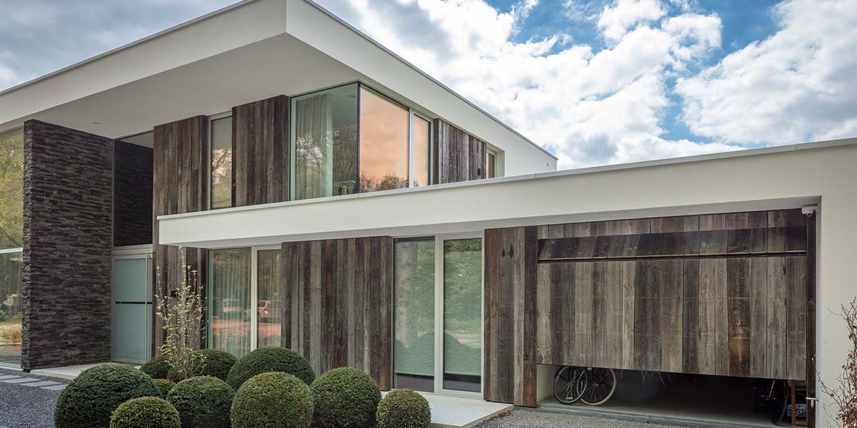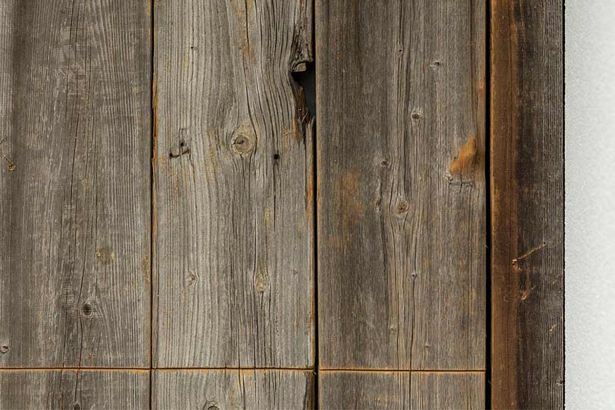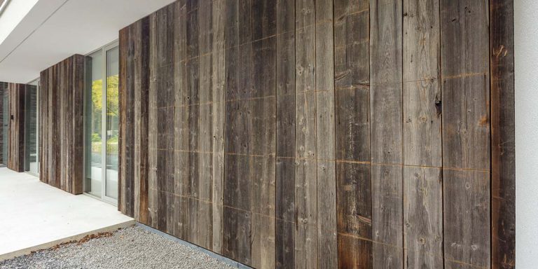 Deze houtsoorten heeft men vaak al decennia laten drogen om er vervolgens de schuren mee te bekleden. Zo heeft het Barnwood vaak honderden jaren tegen de schuren gezeten voordat het eraf gehaald is om er nu mooie gevels mee te bekleden. Different Doors produceerde en monteerde de gevel die mooi aan sluit bij de woning.