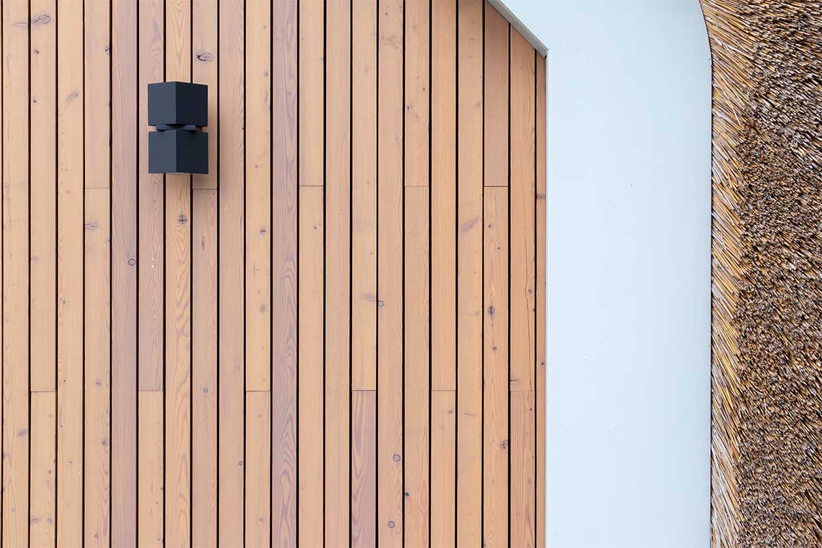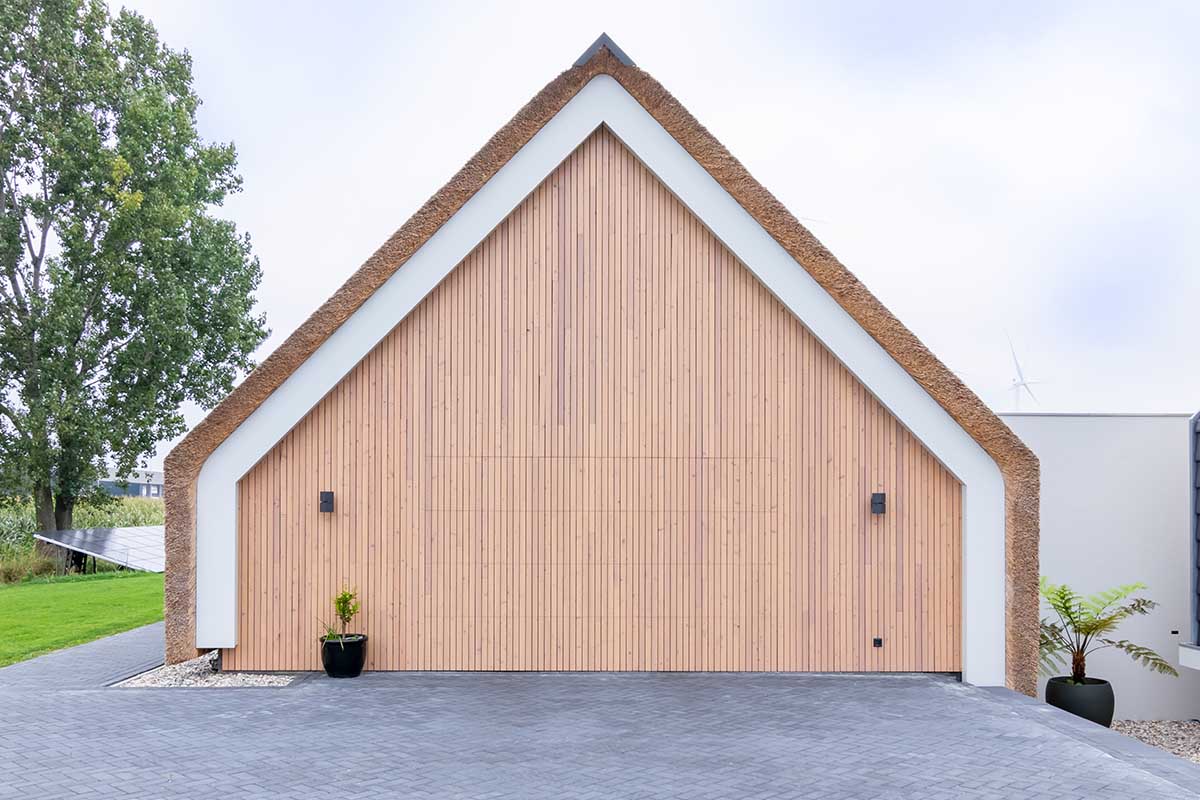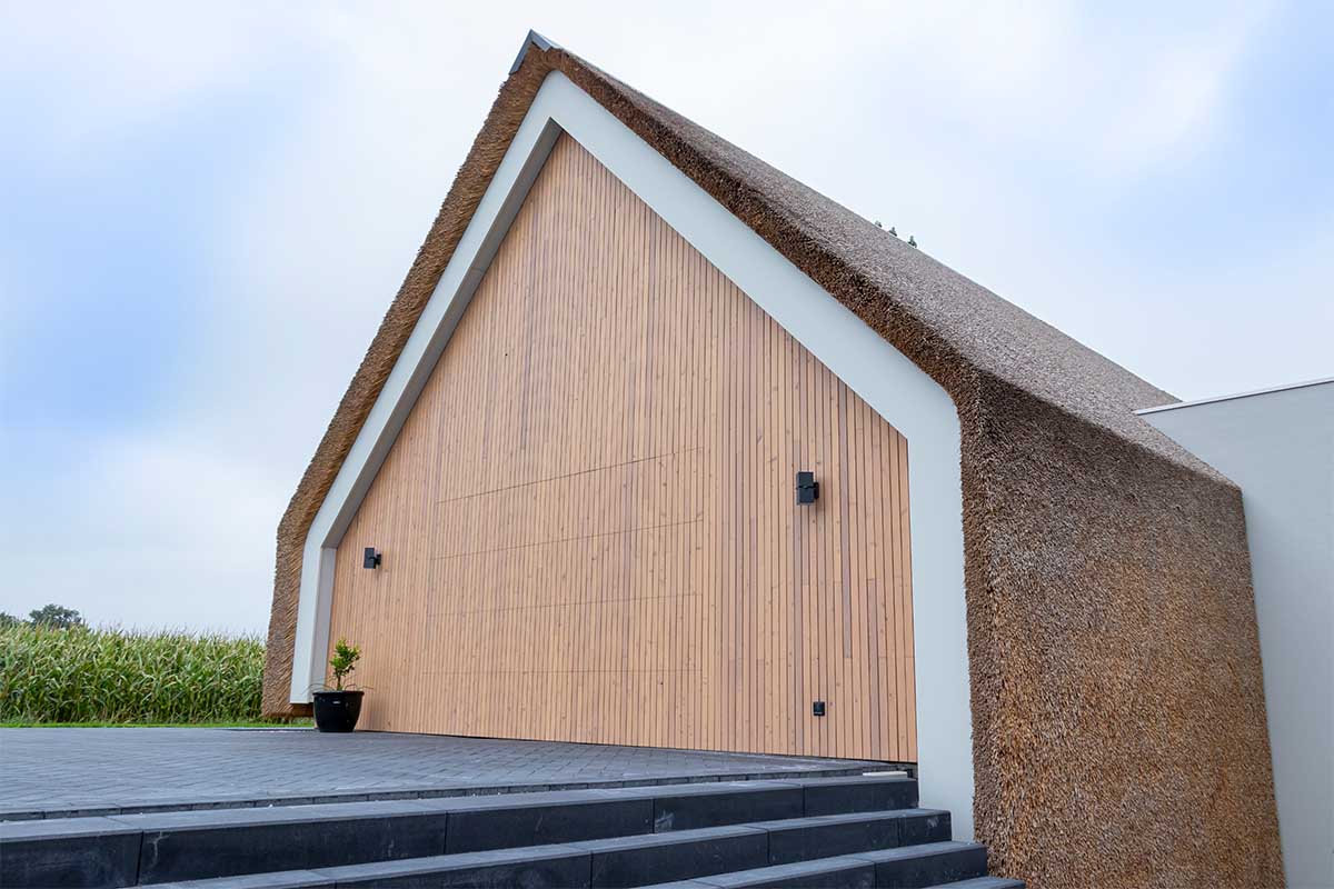 Bij deze zeer fraaie schuurwoning in Gelderland heeft Different Doors de houten garagedeur mogen verzorgen. De rietgedekte garage met volledig houten gevel inclusief elektrische houten sectionaaldeur mag met recht een uniek object worden genoemd.