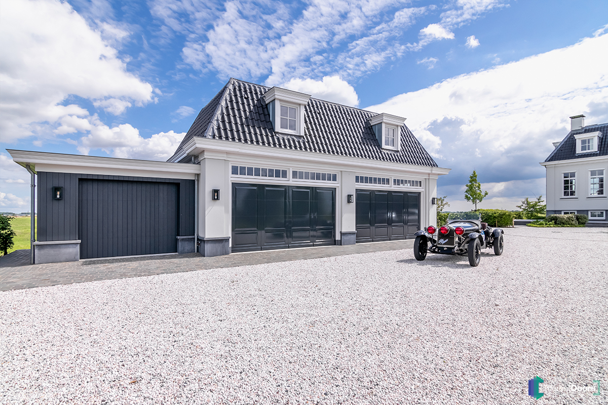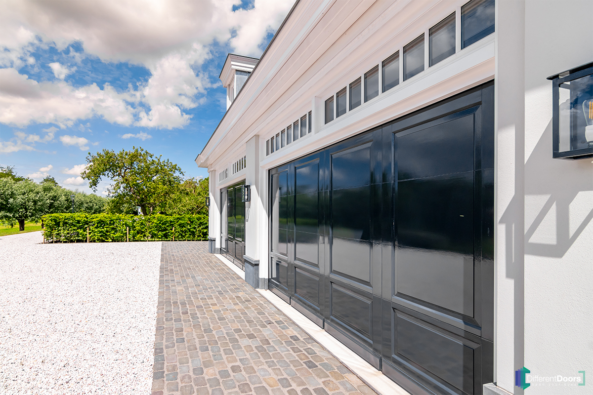 Een onbeschrijflijk mooi project waarbij Different Doors maar liefst drie houten sectionaaldeuren heeft mogen plaatsen. Twee van de drie garagedeuren zijn uitgevoerd in klassieke stijl met prachtige bossing panelen en specifieke houten details. De derde houten garagedeur met verticale latten is achter de dag gemonteerd maar loopt perfect over op de gevelbekleding.