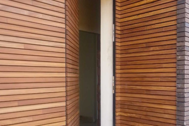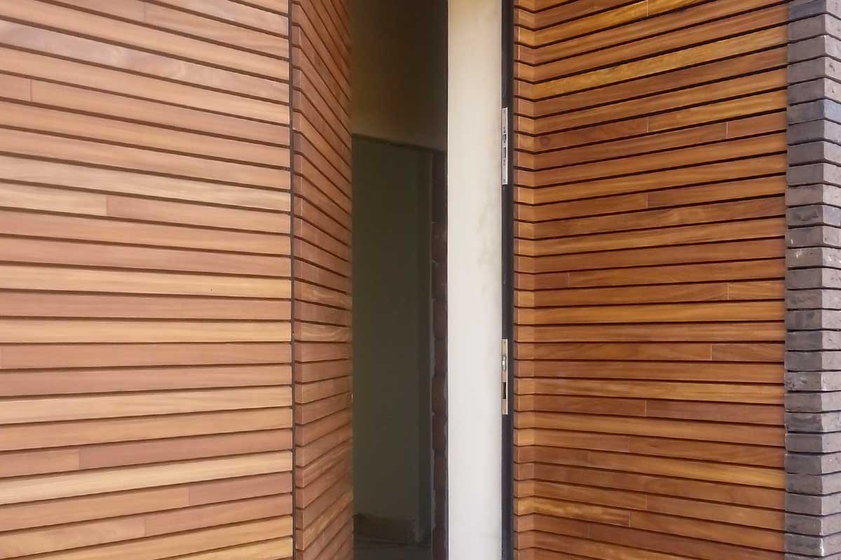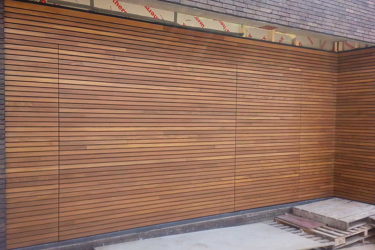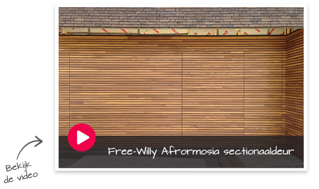 Het montageteam van Different Doors heeft in Mol (Belgie) deze prachtige Free-Willy houten sectionaaldeur + voordeur geplaatst, geheel weggewerkt in houten gevelbekleding. Voor dit project is Afrormosia hout gebruikt, uitgevoerd met schuine latten en twee keer gegrond.