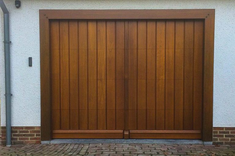 In Geel (België) monteerde het team van Different Doors deze mooie houten sectionaaldeur in dezelfde stijl als de rest van het huis. Deze elektrisch houten deur is verticaal geprofileerd. Omdat de deur naar binnen toe openslaat, is een weldorpel aangebracht voor de afvoer van regenwater en voor een nette overgang is gebruik gemaakt van een neut. Verder is gebruik gemaakt van een slaglat en kraaldelen. De deur wordt elektrisch bediend en vouwt zich langs het plafond wanneer deze wordt geopend. Zo bespaart u veel ruimte langs de muren.