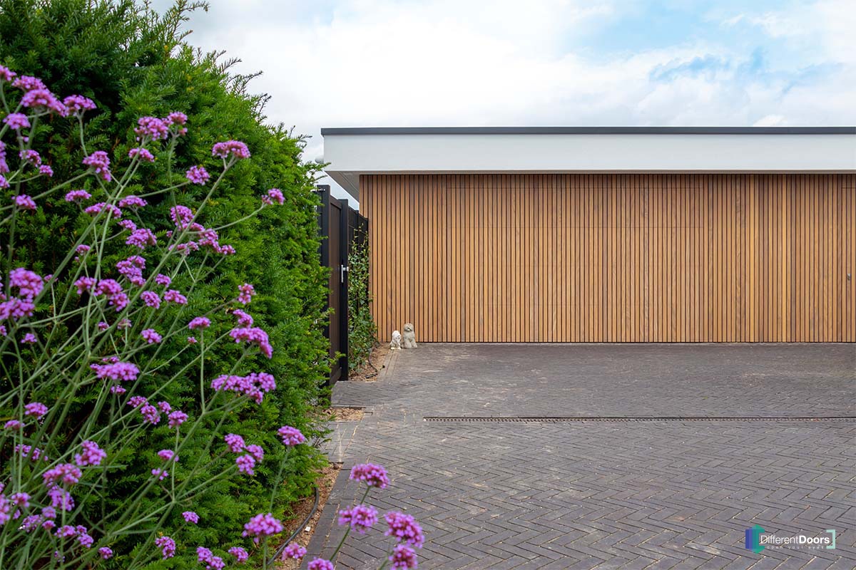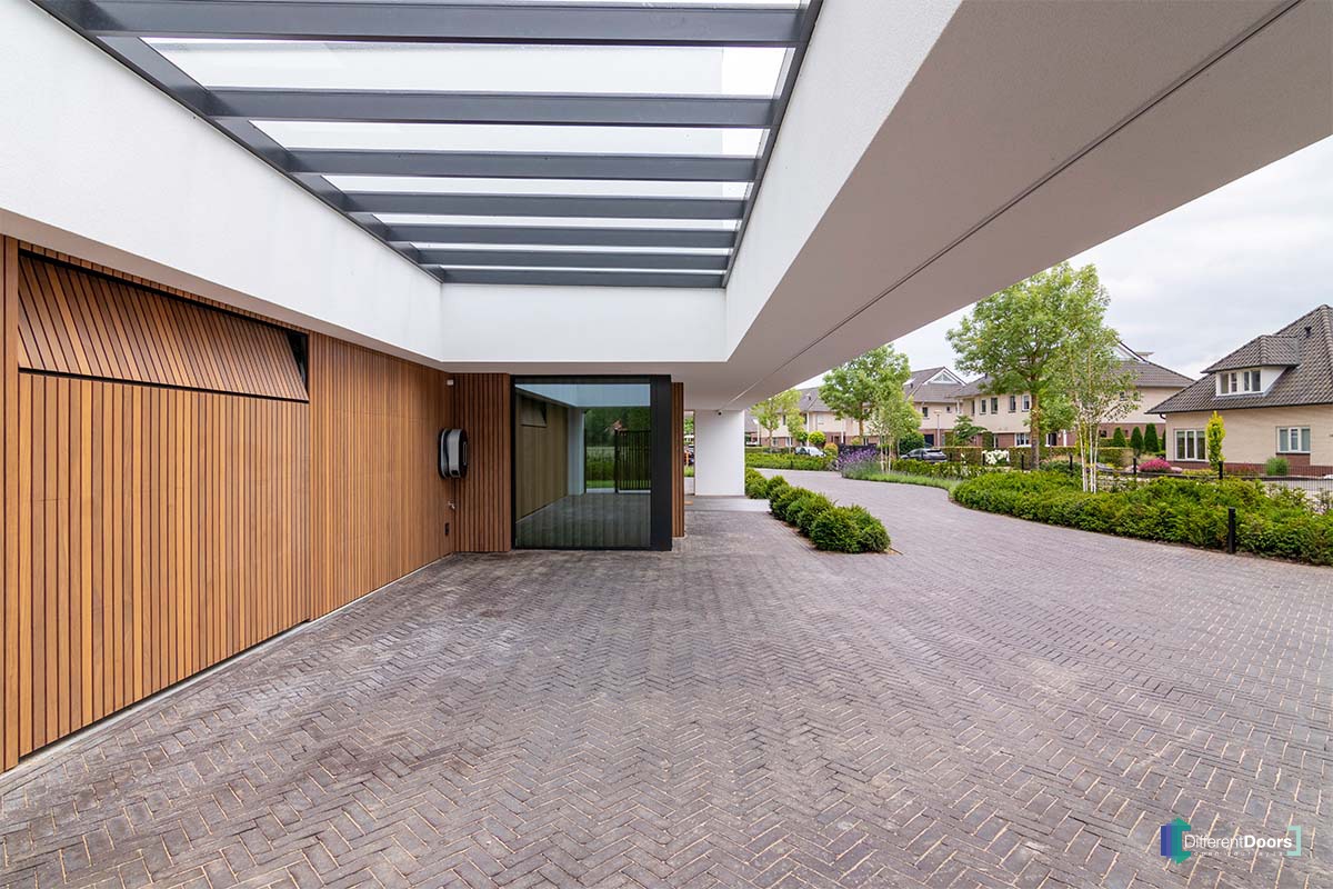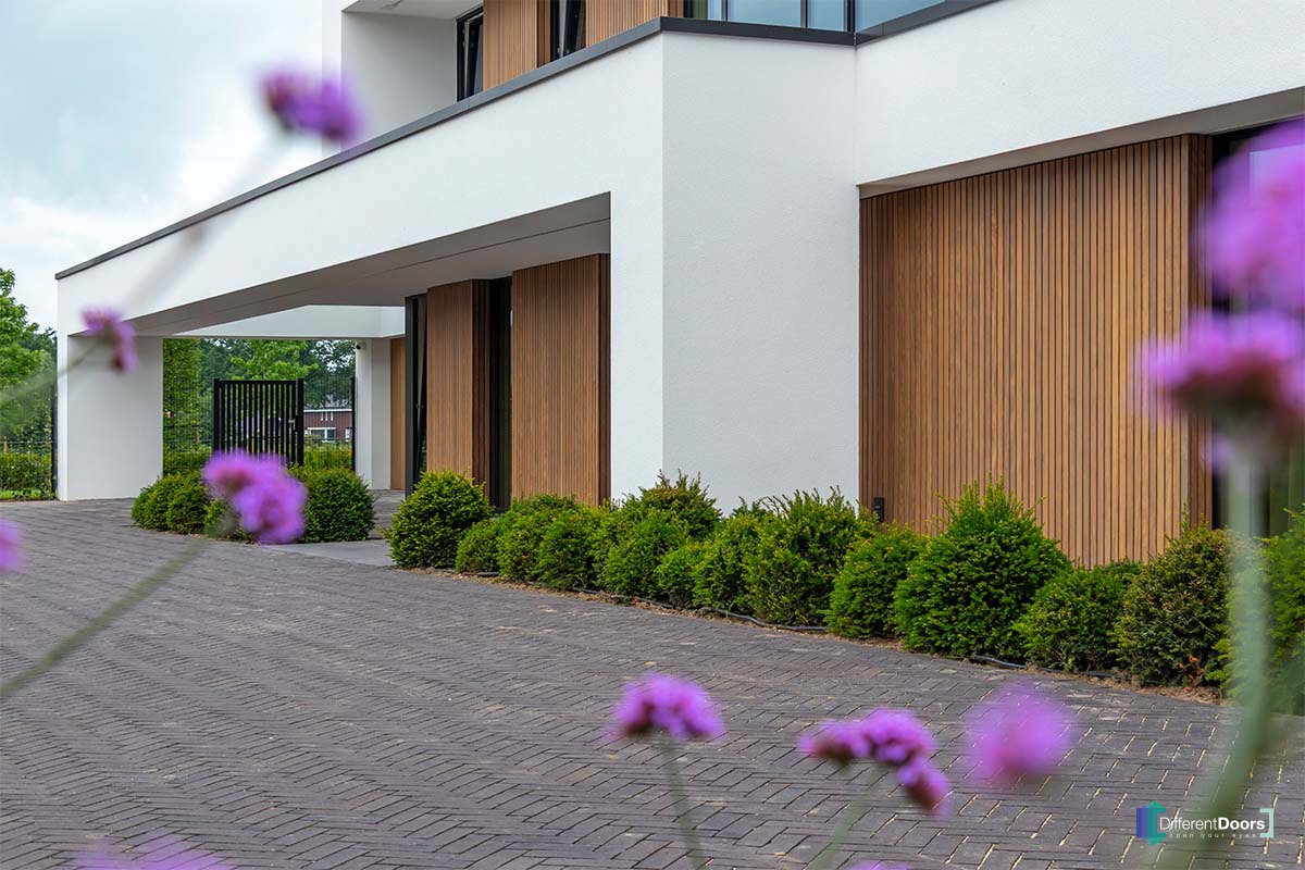 Different Doors realiseerde een wel heel exclusief project. In deze moderne villa zijn maar liefst vier houten sectionaaldeuren verwerkt. Daarnaast is ook de gevelbekleding door Different Doors gemaakt en geplaatst. Het contrast van wit stucwerk, hout en een prachtig aangelegde tuin is bijzonder fraai te noemen.