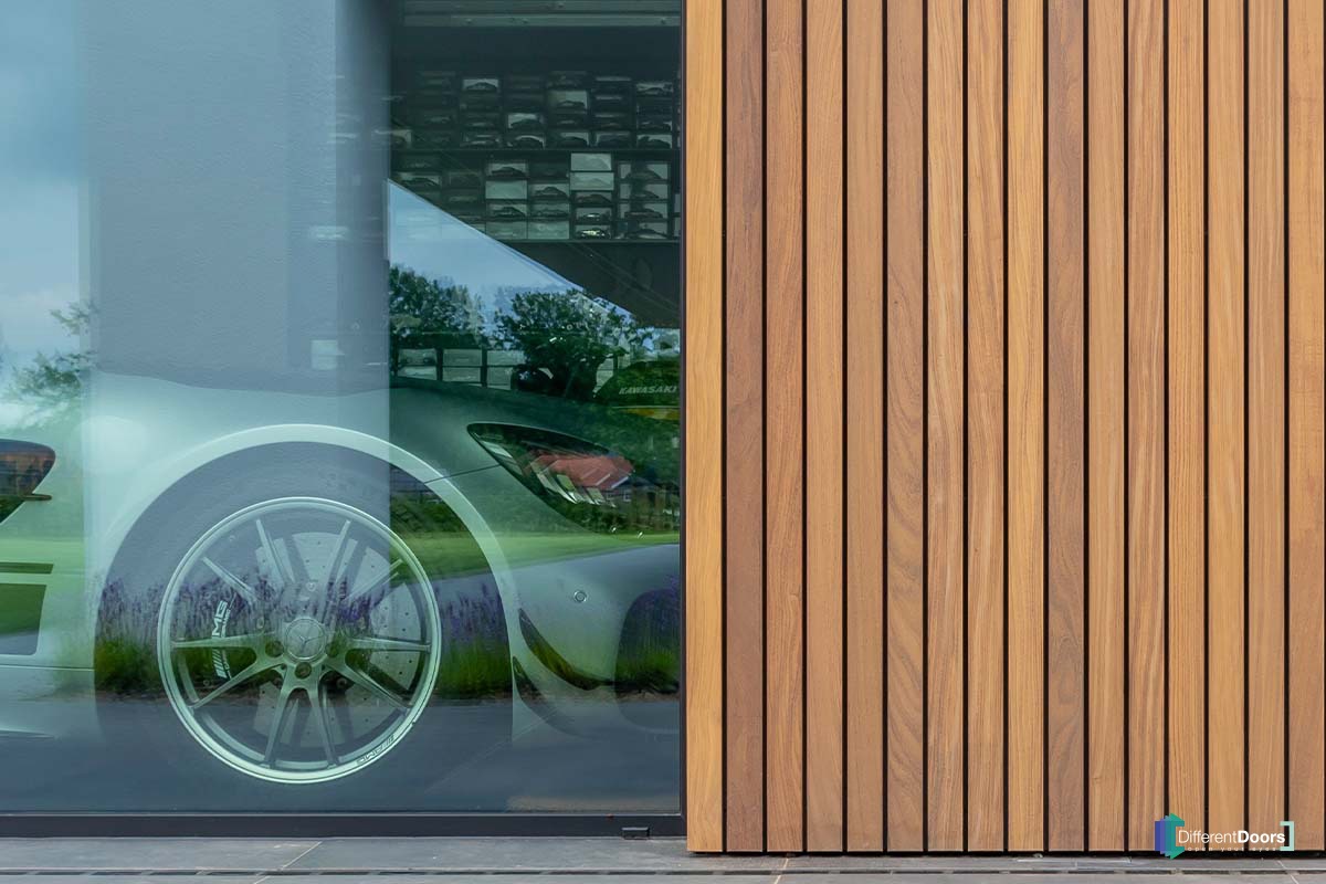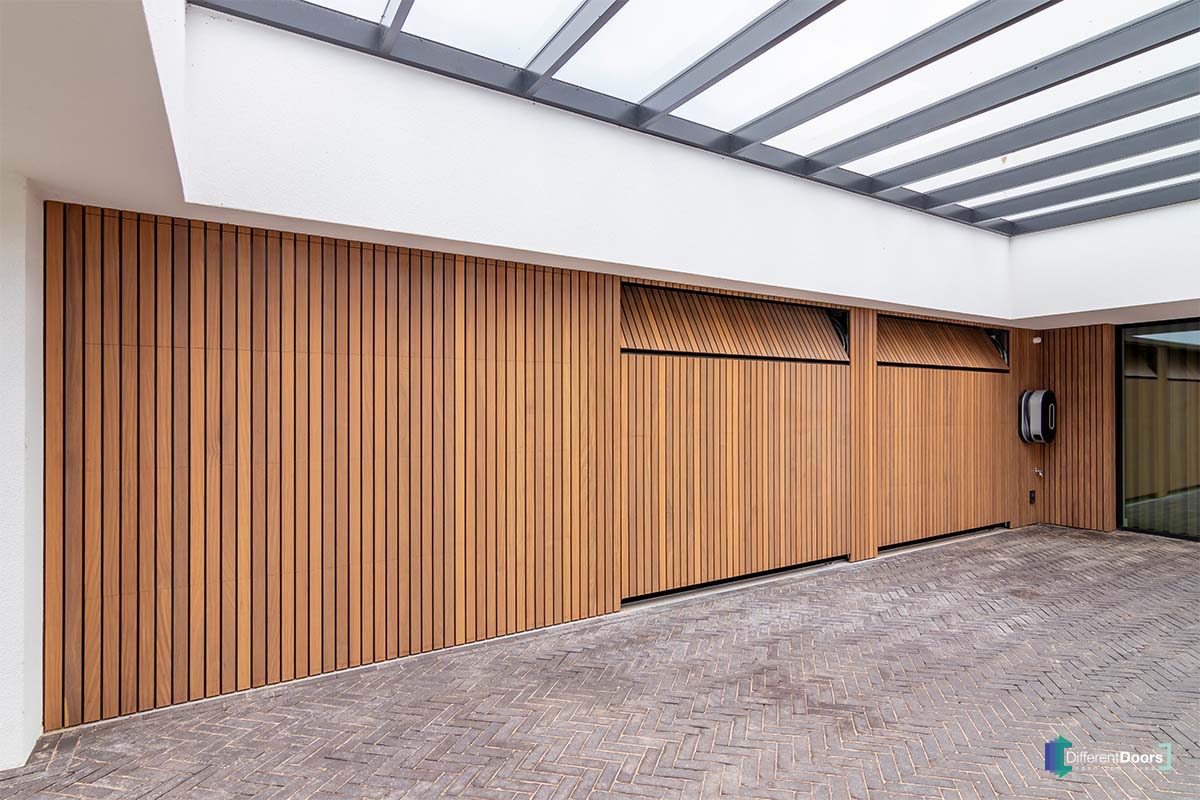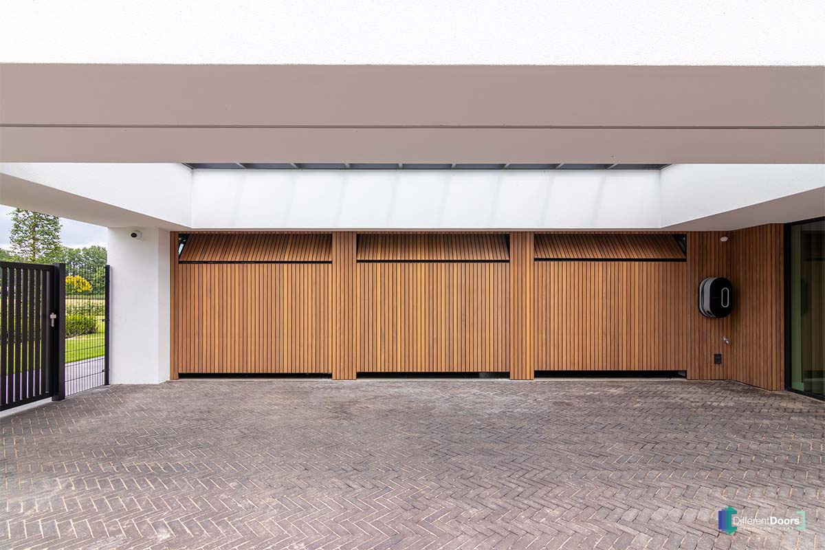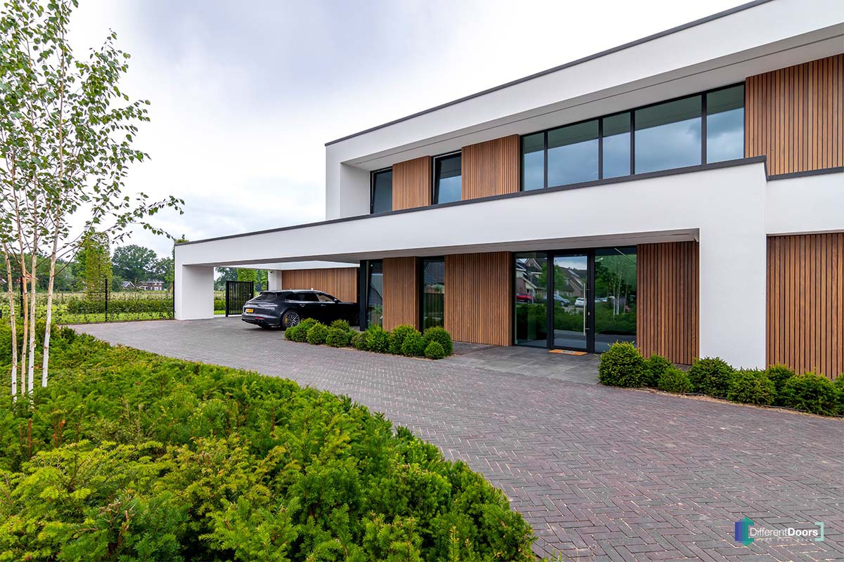 Different Doors realiseerde een wel heel exclusief project. In deze moderne villa zijn maar liefst vier houten sectionaaldeuren verwerkt. Daarnaast is ook de gevelbekleding door Different Doors gemaakt en geplaatst. Het contrast van wit stucwerk, hout en een prachtig aangelegde tuin is bijzonder fraai te noemen.