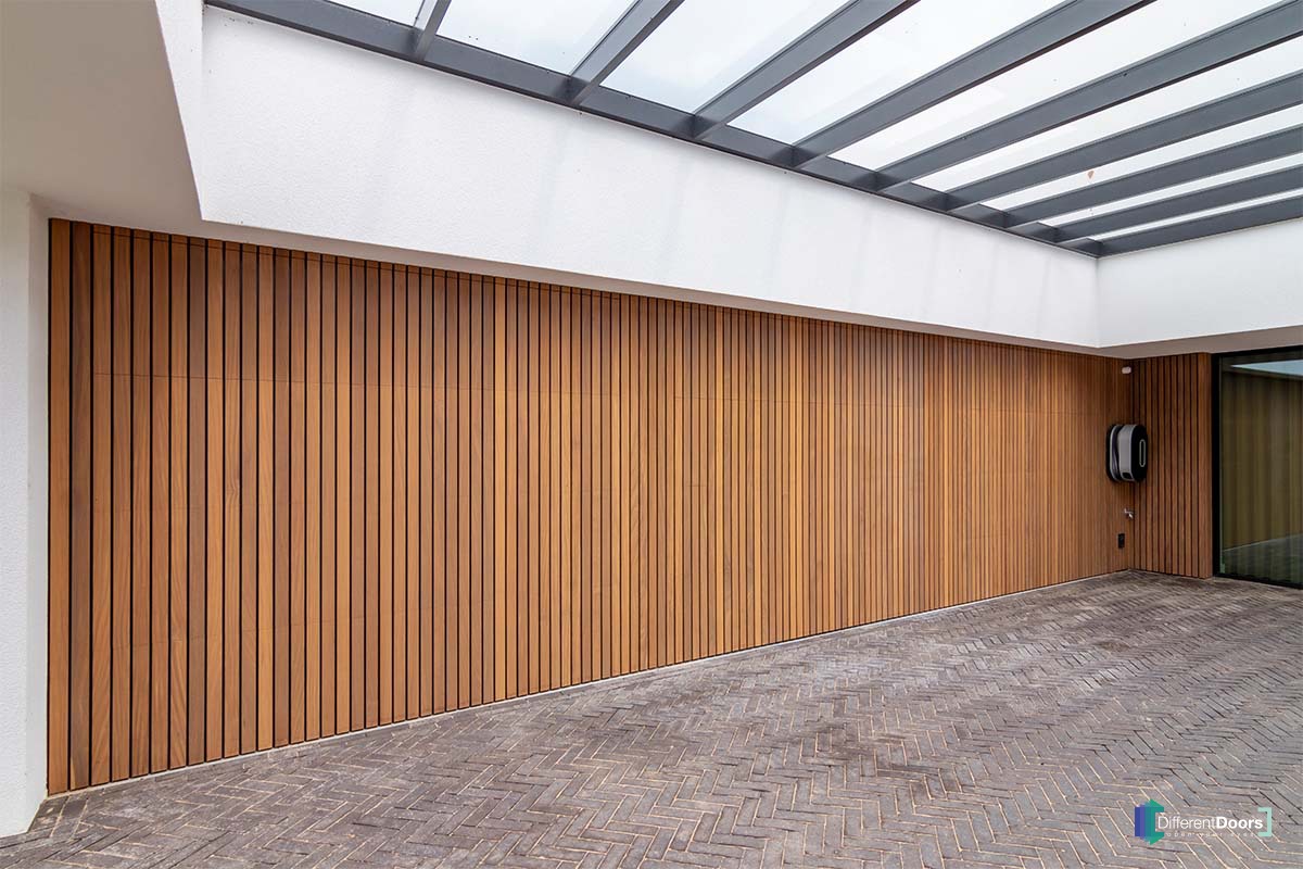 De garagedeuren zijn geheel geïntegreerd in de gevel, die gelijk doorstrookt met de houten deurpanelen. Op deze manier valt de garagedeur weg in de houten gevel en wordt de garagedeur onzichtbaar in het geheel. Garagedeuren geïntegreerd in een gevel is in elke stijl toepasbaar. Het zorgt voor een prachtige, natuurlijke en luxueuze uitstraling van uw woning.