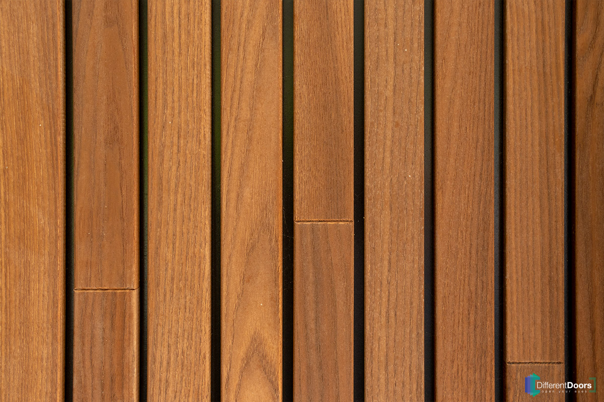 De garagedeur is vervaardigd van verticale houten latten van hoogwaardig essenhout, dat bekend staat om zijn duurzaamheid en prachtige uiterlijk. De fraaie kleurnuances van het essenhout komen prachtig tot uiting, variërend van licht tot donkerbruin. Daarnaast is de karakteristieke vlamtekening prominent zichtbaar, wat de deur een dynamische en luxe uitstraling geeft.