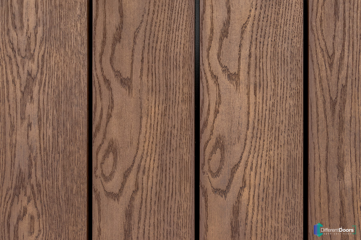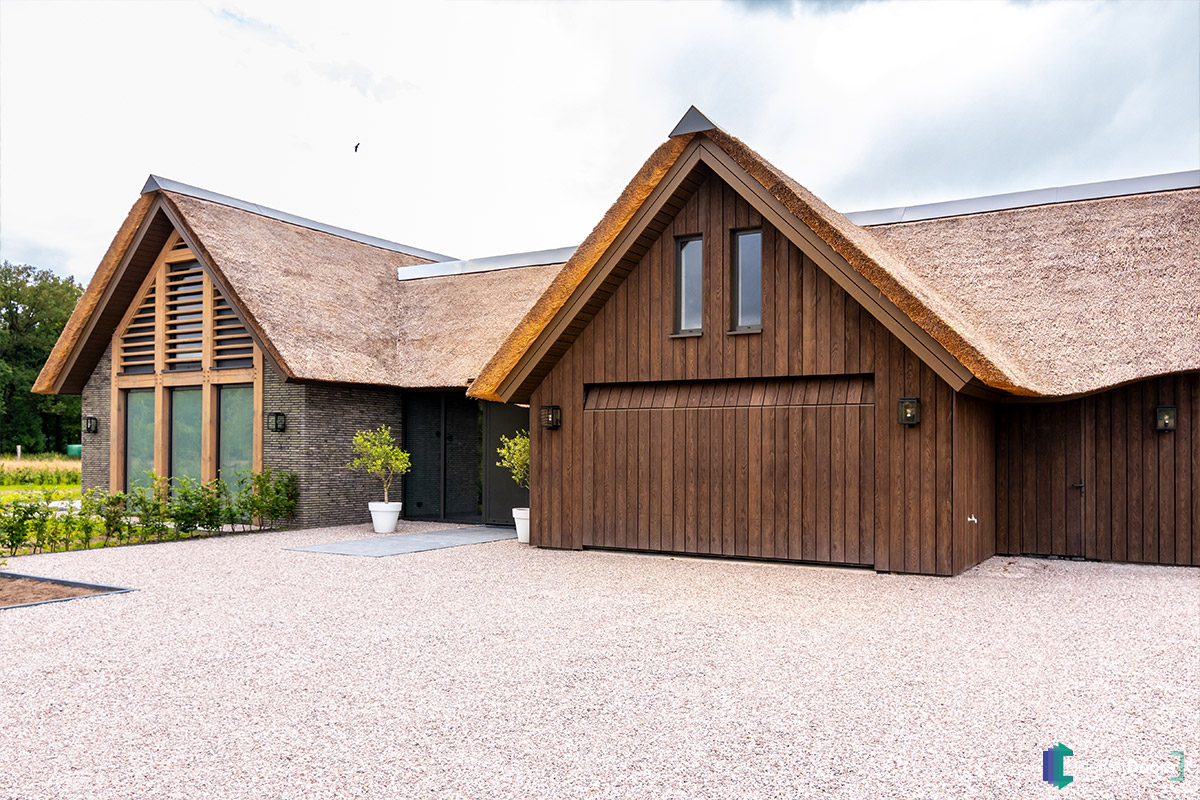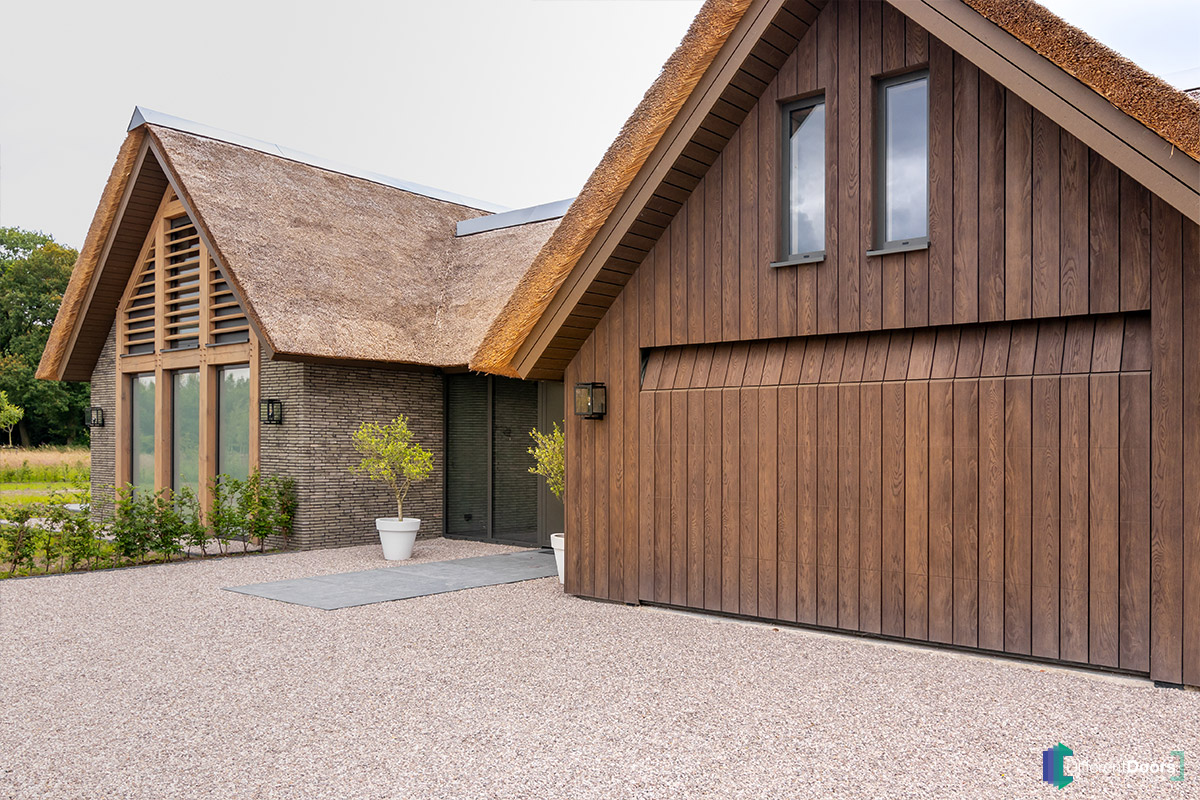 Op het eerste oog is dit weer een prachtige woning met een houten garagedeur van Different Doors. De warme bruine tinten en de karakteristieke vlamtekening komen duidelijk naar voren. Echter hebben we bij dit project gebruik gemaakt van Millboard, een onderhoudsvrij materiaal dat de authentieke uitstraling van hout perfect weet weer te geven.
