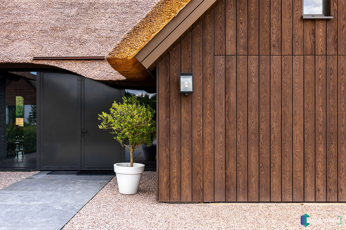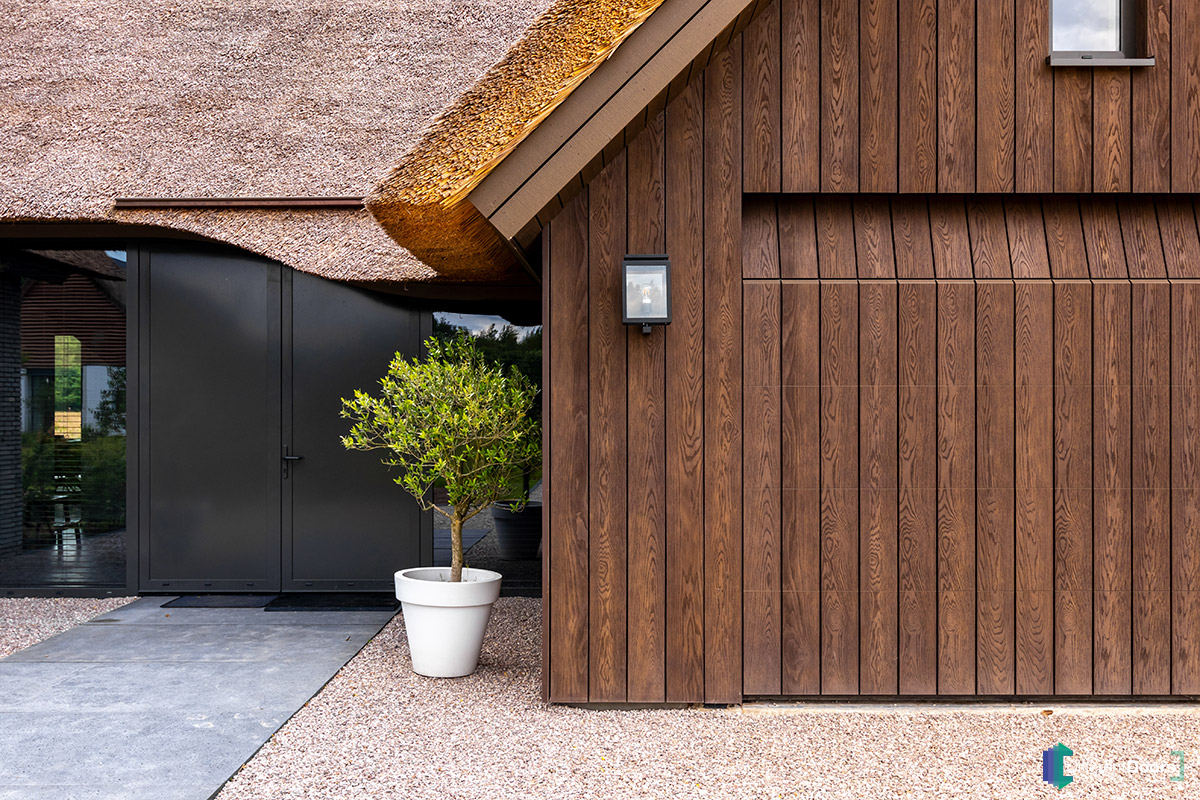 Voor de garagedeur en gevelbekleding is er gebruik gemaakt van Millboard, een onderhoudsarm materiaal dat bekend staat om zijn duurzaamheid. Het is uv- en weerbestendig, vlekbestendig en splintervrij, waardoor het materiaal zijn prachtige uitstraling jarenlang behoudt, ongeacht de weersomstandigheden. Voor dit project is er gebruik gemaakt van het type Enhanced Grain in de kleur Antique Oak. De afwerking van de houtnerf heeft een fijne structuur waarmee de subtiele nuances van eikenhout worden nagebootst.