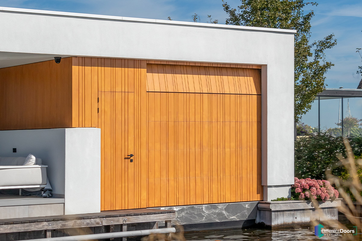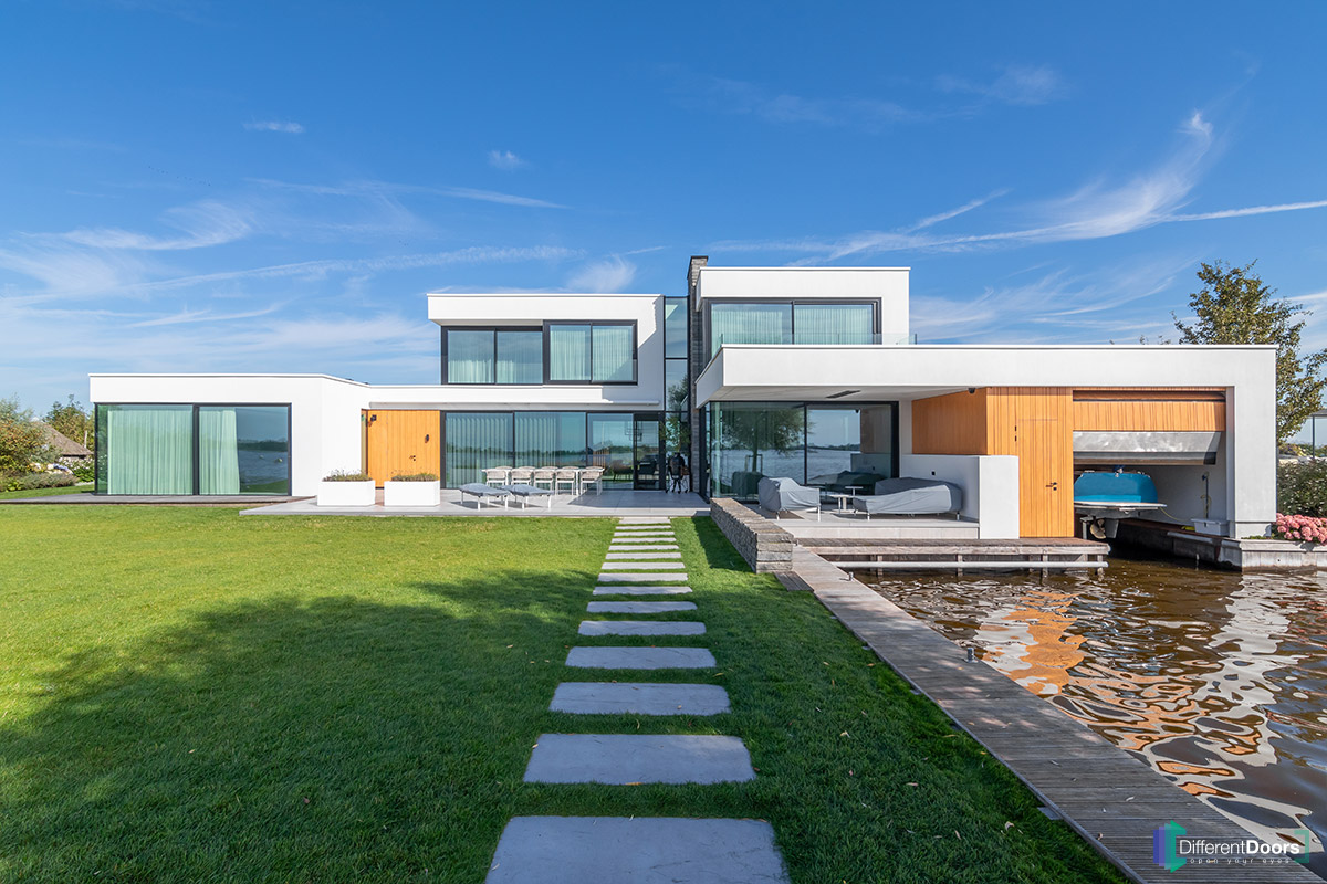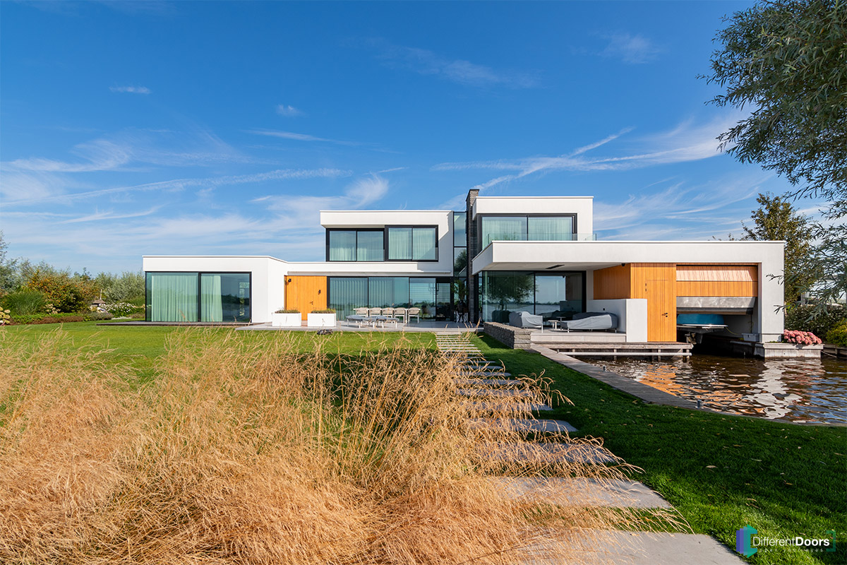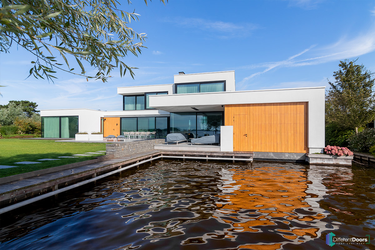 Bij een indrukkwekkende woning, prachtig gelegen aan het water, heeft Different Doors aan de voorzijde een houten sectionaaldeur achter de dag mogen plaatsen. Aan de achterzijde beschikt de woning over een botenhuis waar een houten sectionaaldeur en loopdeur gelijk in de gevel zijn gerealiseerd.