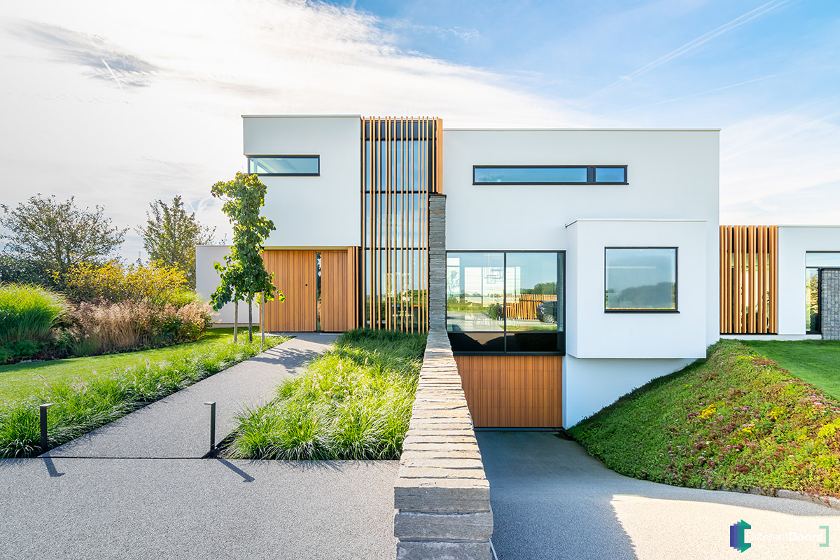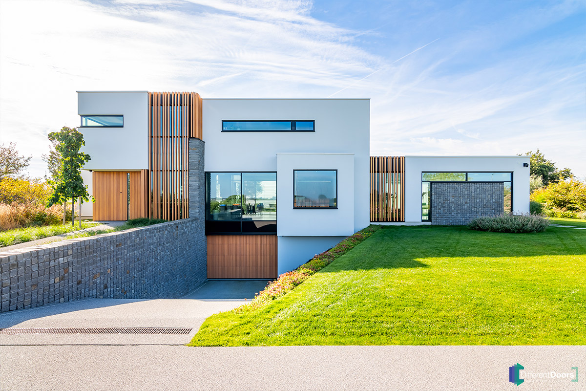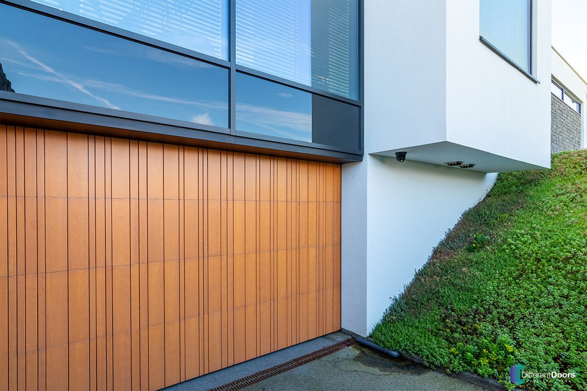 Aan de voorzijde van de woning is bij de aflopende oprit een tweede houten sectionaaldeur geplaatst. Deze is vervaardigd van hetzelfde hout als de houten garagedeur en loopdeur aan de achterzijde van de woning. Dit zelfde geldt voor de overige houten elementen op en rondom de woning. Hierdoor ontstaat een uniforme uitstraling, die alleen kan worden bereikt wanneer het gebruikte hout afkomstig is uit dezelfde batch. Dit wordt mogelijk gemaakt doordat hout aangeleverd kan worden bij Different Doors, dat vervolgens gebruikt wordt voor het maken van de garagedeur.