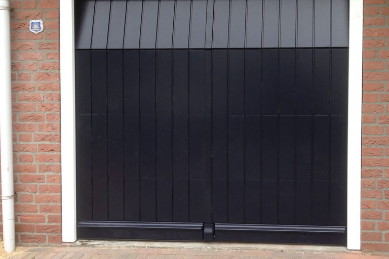 Een mooie houten garagedeur gemonteerd te Belfeld. Deze houten garagedeur ziet er uit als twee openslaande garagedeuren, maar is praktisch te gebruiken als sectionaaldeur. De houten garagedeur is voorzien van weldorpel, slaglat en neutje en uitgevoerd in RAL kleur naar keuze.
