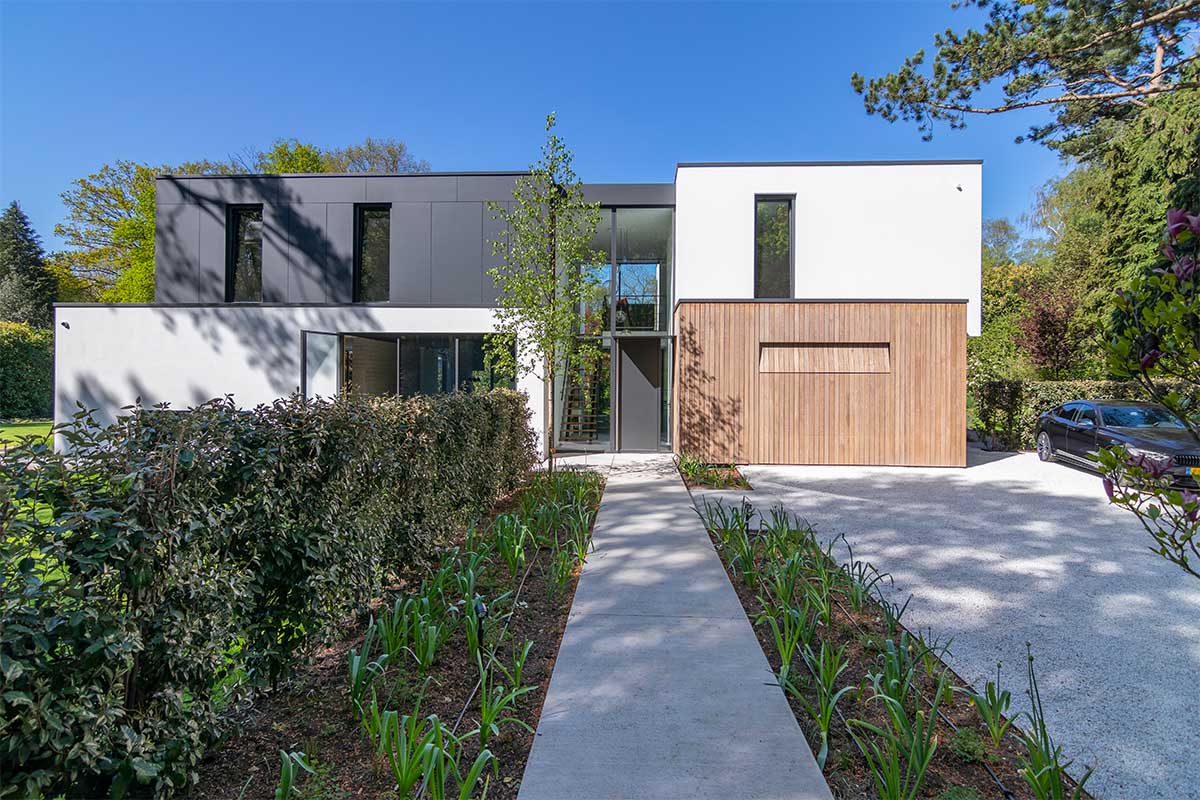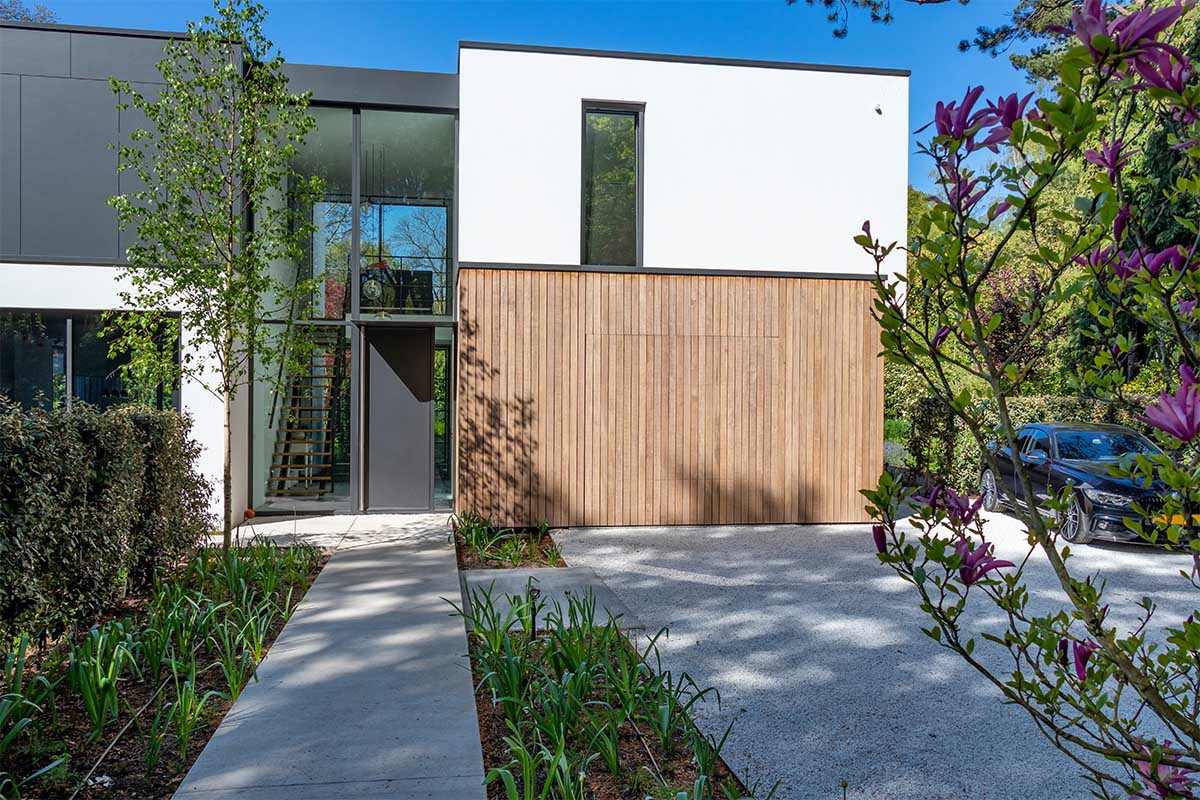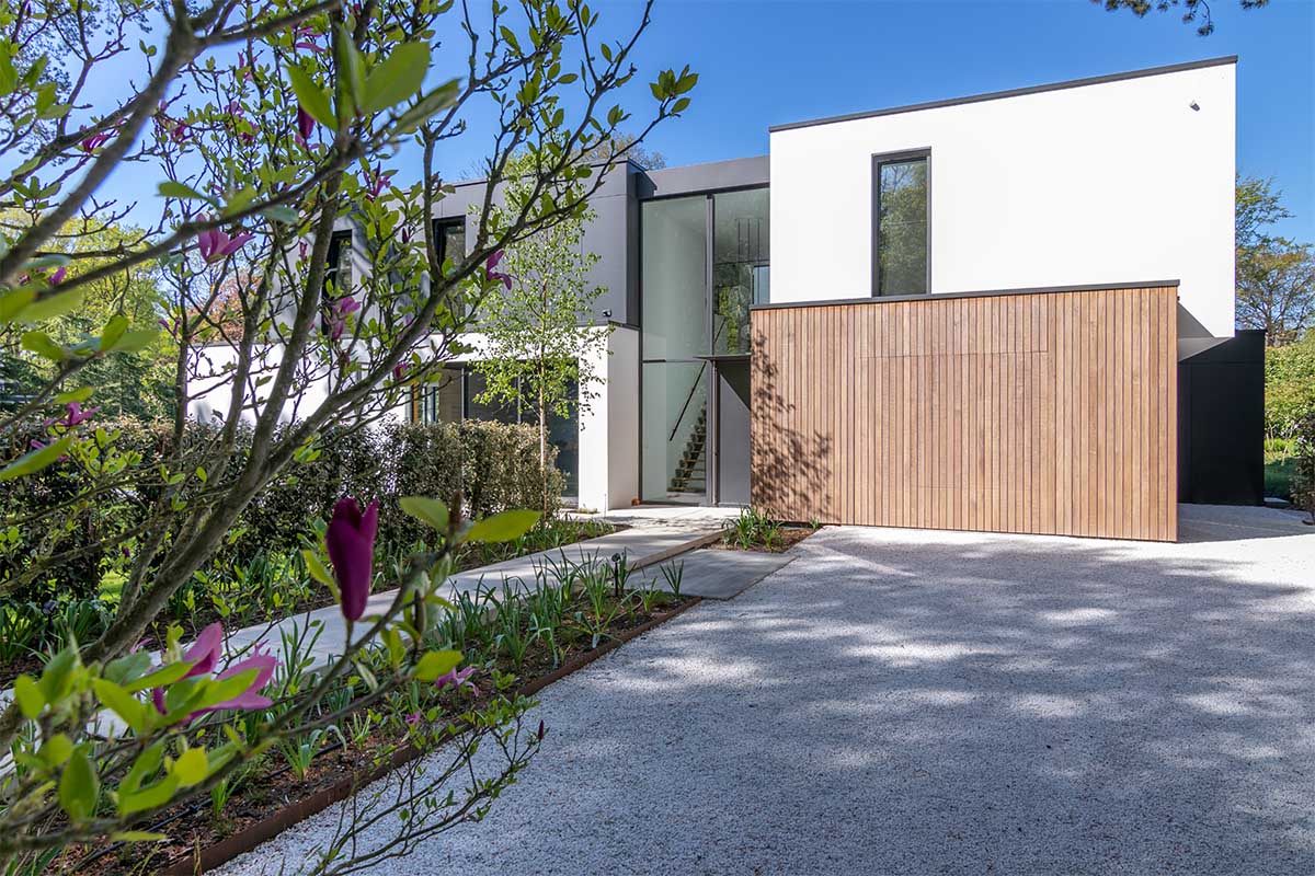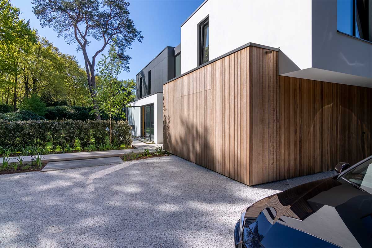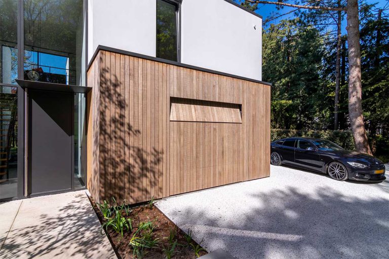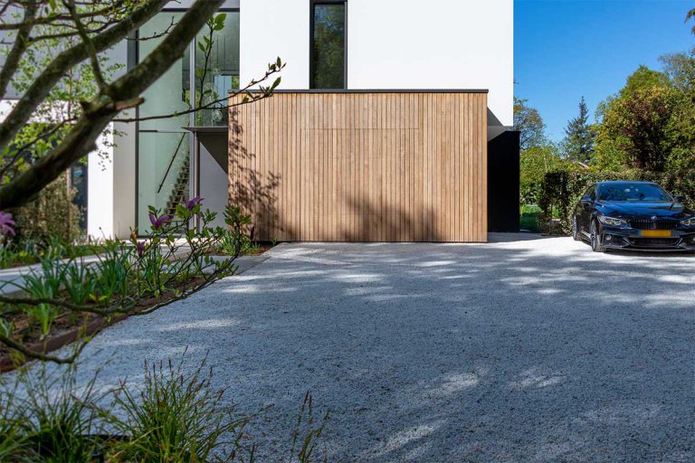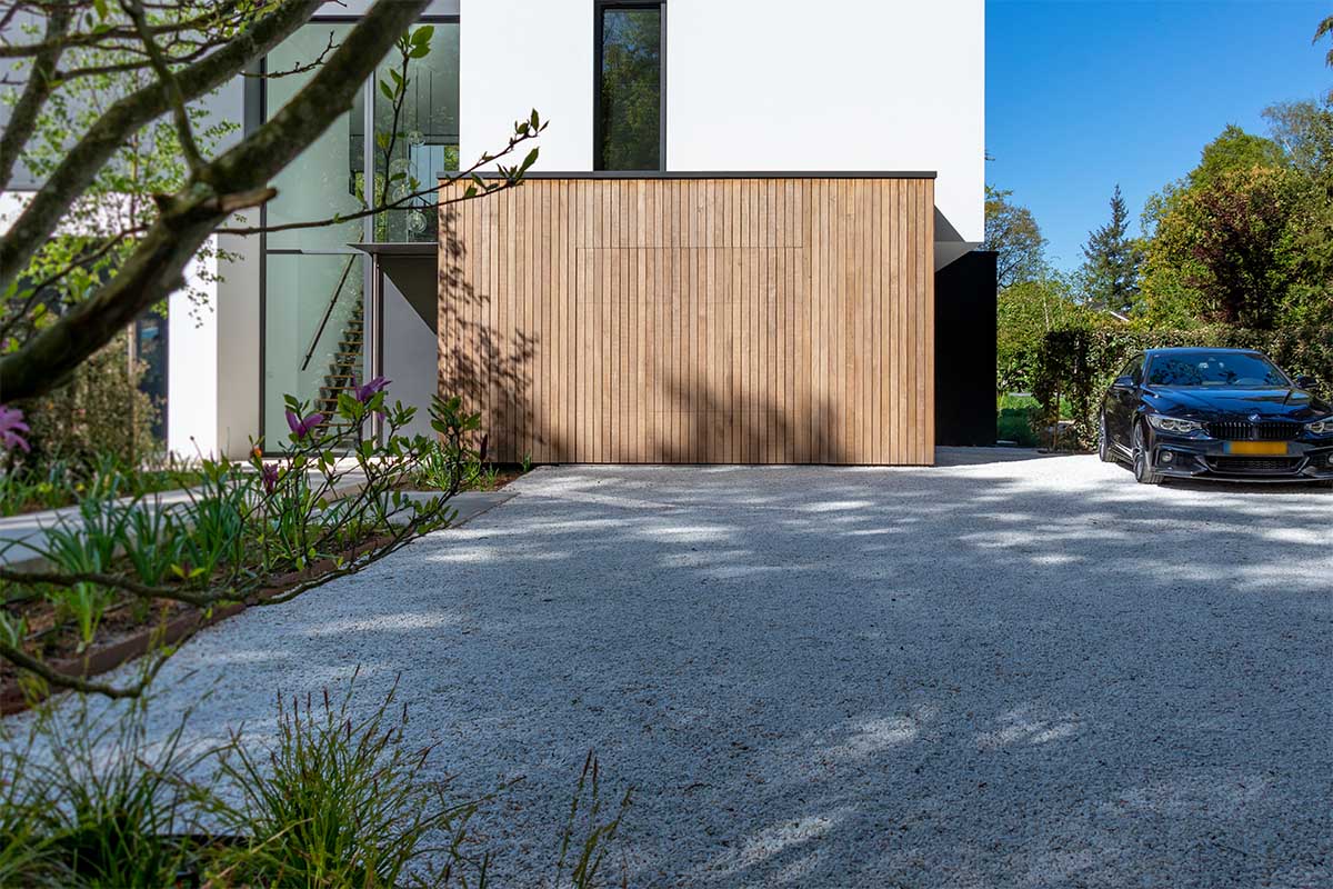 Voor deze moderne villa in ’t Gooi heeft Different Doors een volledig houten garagedeur gelijk met de gevel gerealiseerd. De houten garagedeur is gebruikt als eye-catcher en valt dan ook gelijk op wanneer je de oprit op rijdt.