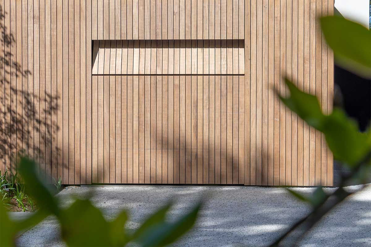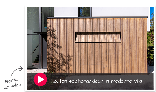 In de wand van de garage is een houten sectionaaldeur geïntegreerd. De deur loopt gelijk met de gevel waardoor hij bij sluiten, vrijwel onzichtbaar wordt in de achterliggende wand. Dit maakt van deze garage een bijzonder fraai geheel.