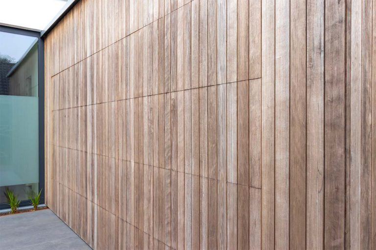 Bij Different Doors werken we met een uitgebreid aanbod aan diverse houtsoorten, klanten kunnen er echter ook voor kiezen om eigen hout bij ons aan te leveren. Dit wordt vaak gedaan wanneer er meerdere houten details in een woning verwerkt zijn en men er verzekerd van wil zijn dat exact dezelfde soort gebruikt wordt. Dat was ook bij deze woning het geval, de klant heeft het hout bij ons afgeleverd waarmee wij vervolgens de garagedeur geproduceerd hebben.