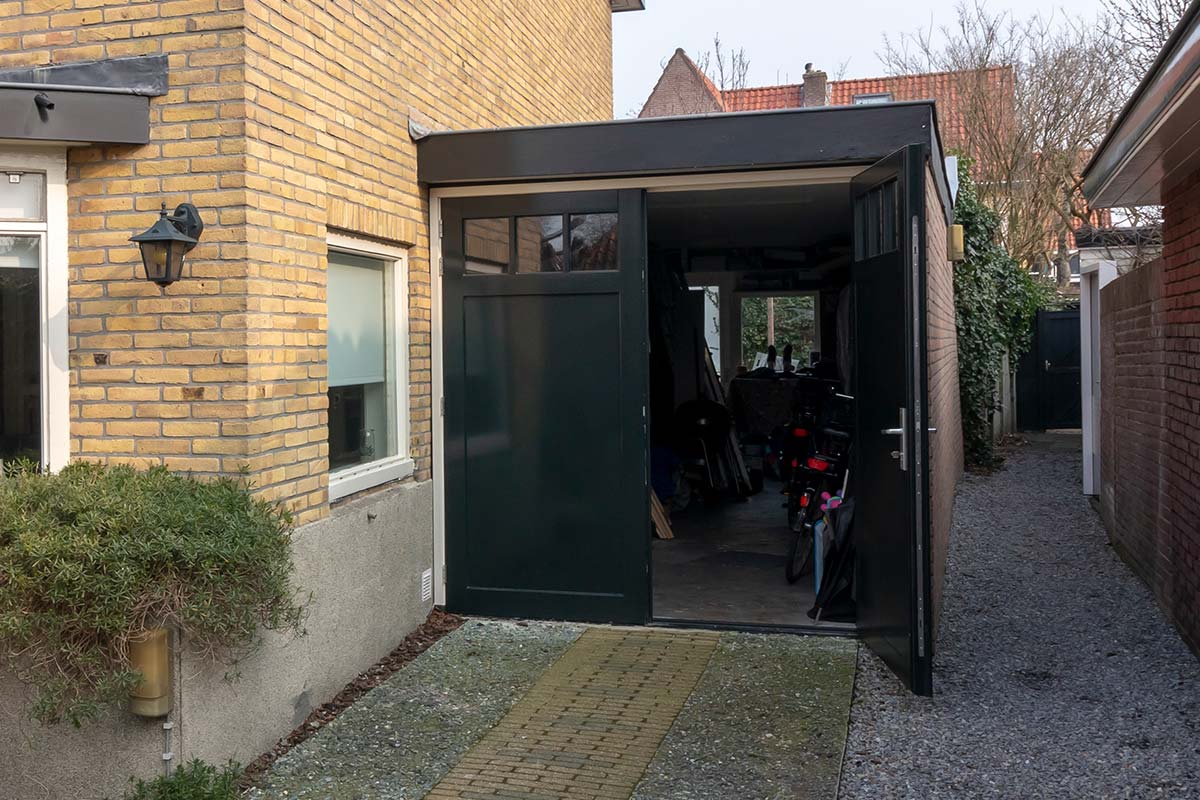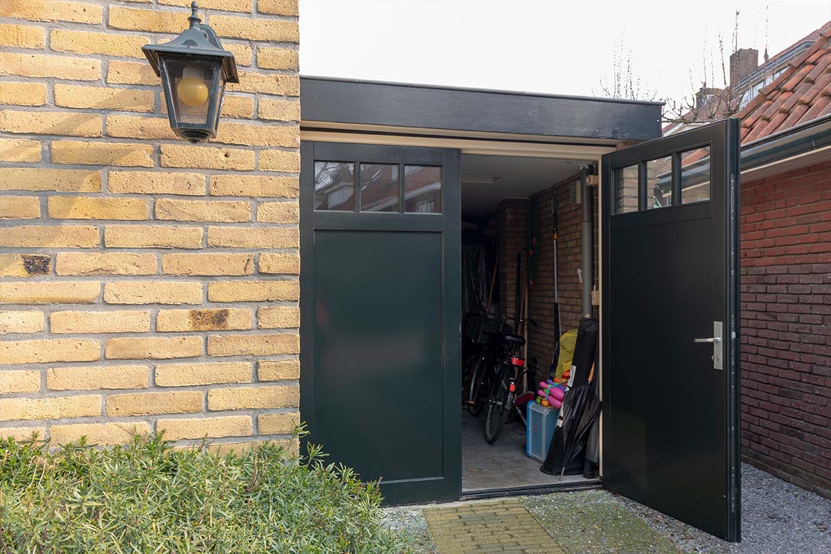 Different Doors realiseerde een mooie houten openslaande garagedeur voorzien van raampjes. Door de toevoeging van de kleine raampjes in de bovenzijde krijgt de deur een klassieke uitstraling en komt er eveneens natuurlijk licht in de garage.