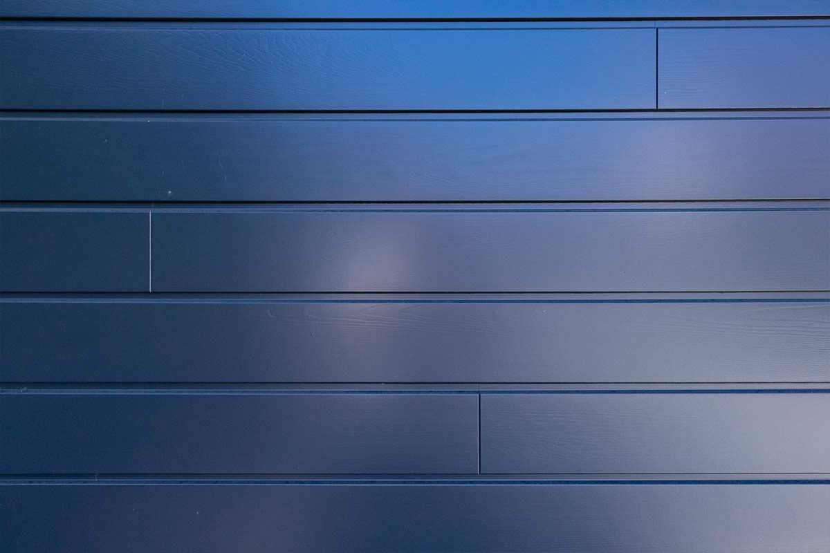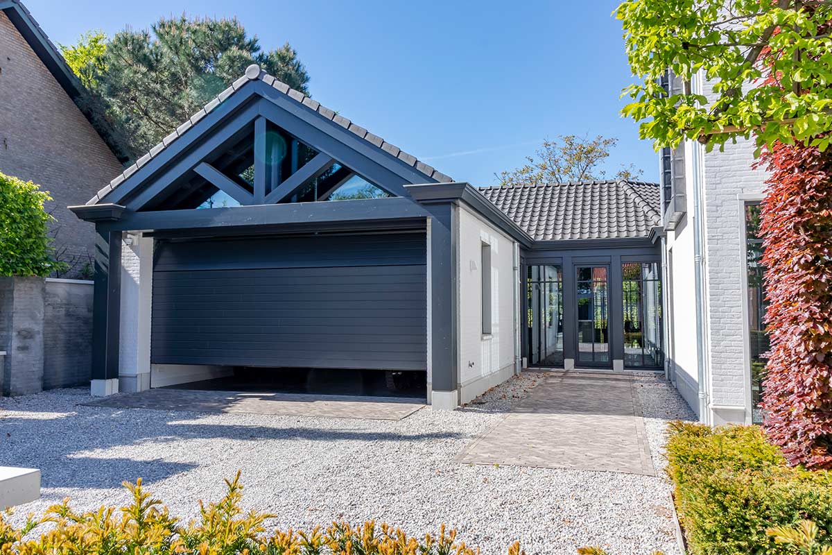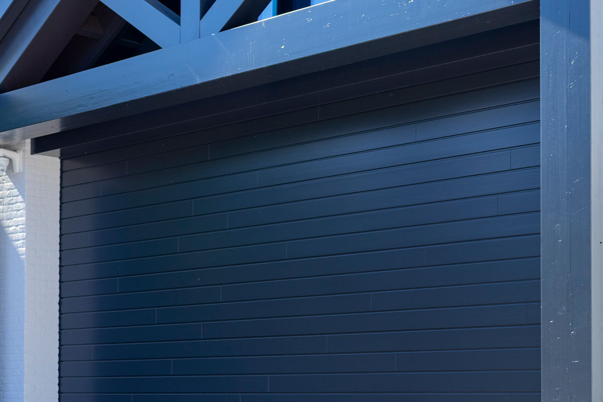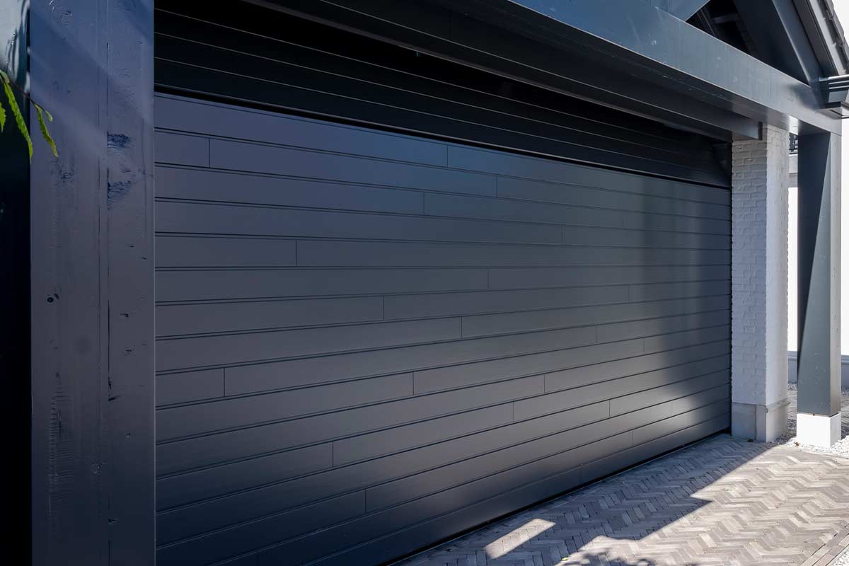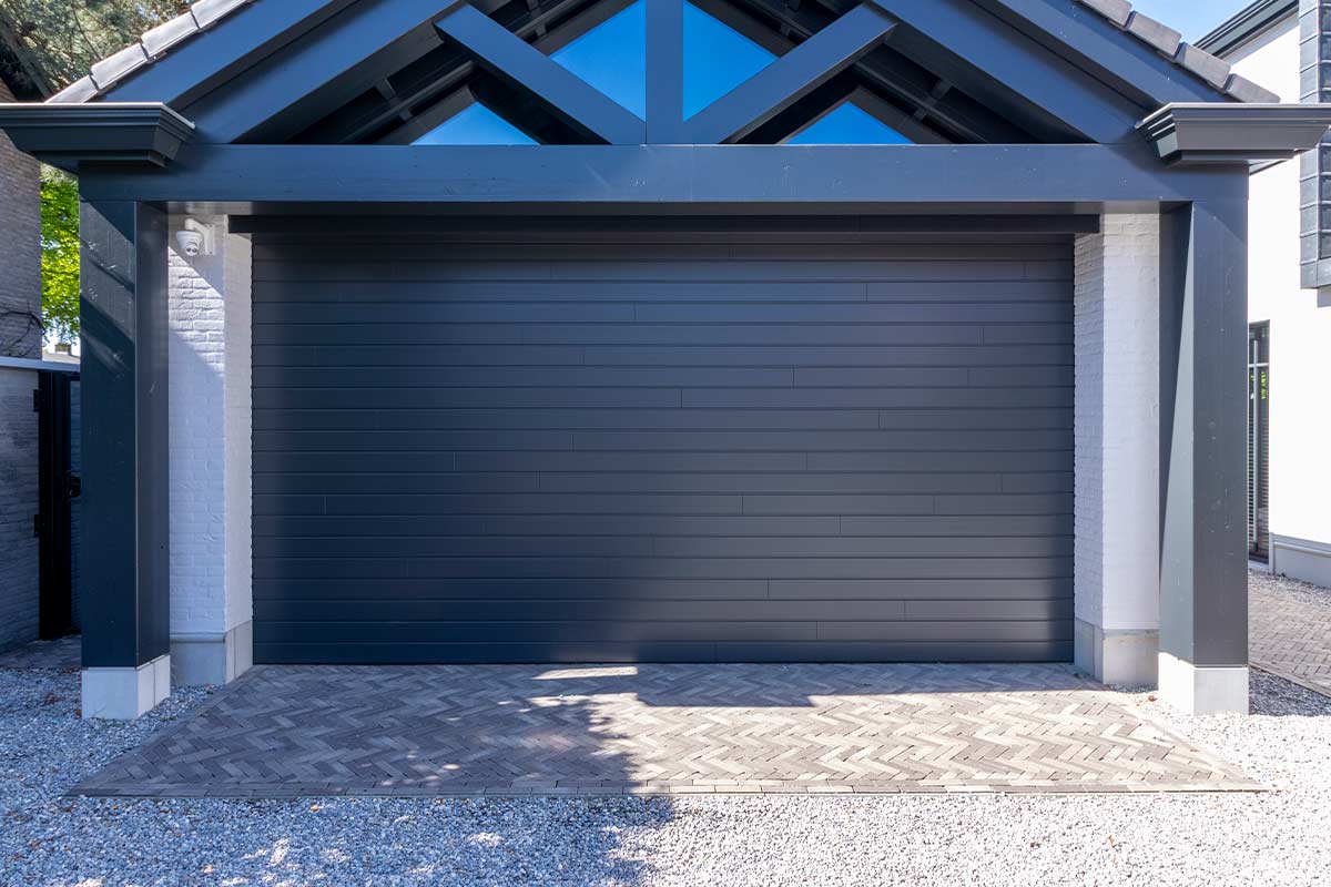Deze houten garagedeur van Red Cedar is een echte eyecatcher. De garagedeur is dekkend grijs blauw geschilderd en past door het kleur- en materiaalgebruik perfect bij het moderne karakter van de naastgelegen woning.