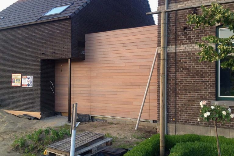 Different Doors monteerde in Bree (België) een houten sectionaaldeur en voordeur. Er is bij dit project gekozen voor de houtsoort Meranti, behandeld met een olie.