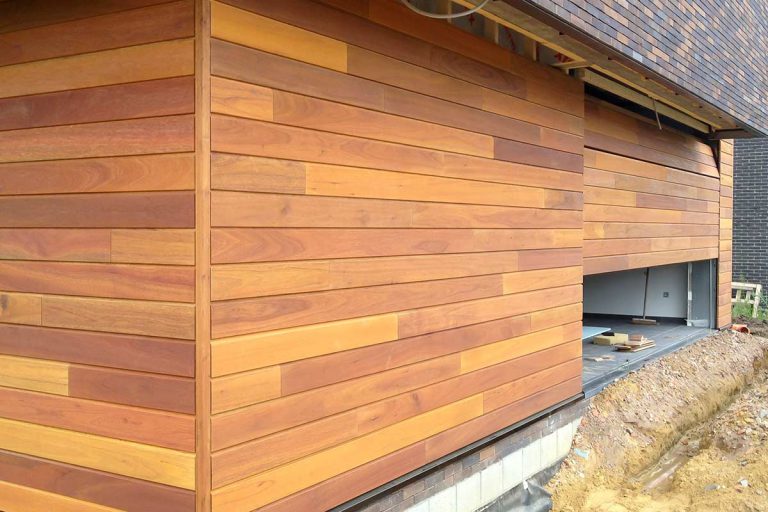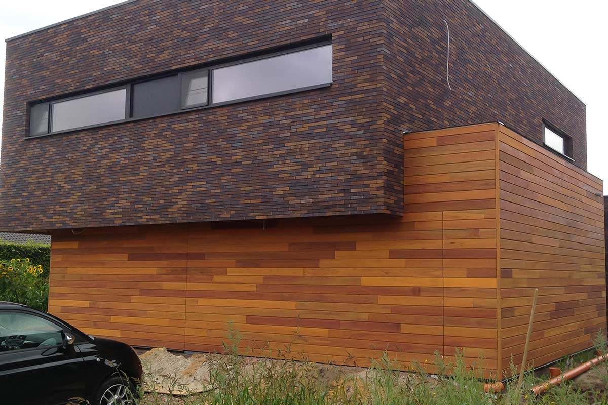 De sectionaaldeur en gevelbekleding zijn uitgevoerd in de houtsoort Meranti, behandeld met een olie. De olie zorgt voor de uiteindelijke kleur van het hout. De kleur van hout past nu perfect bij de gekozen stenen en dit zorgt voor een prachtig eind resultaat.
