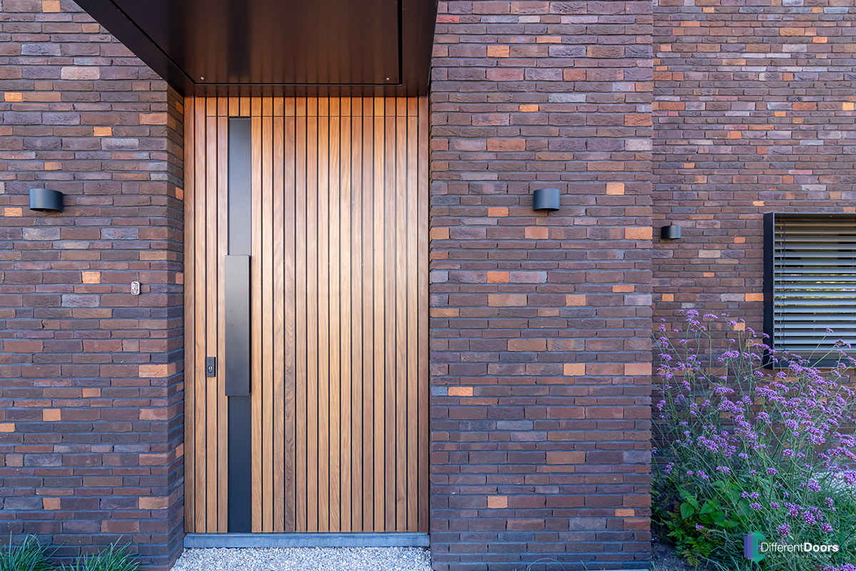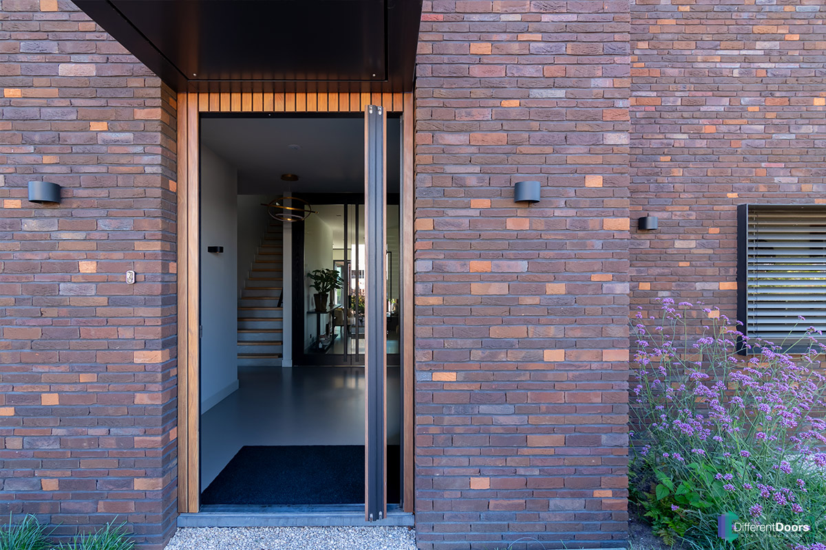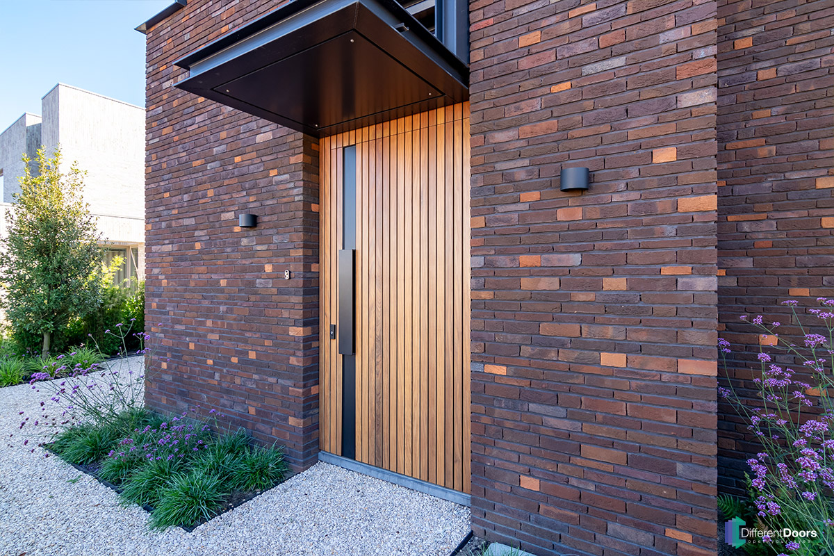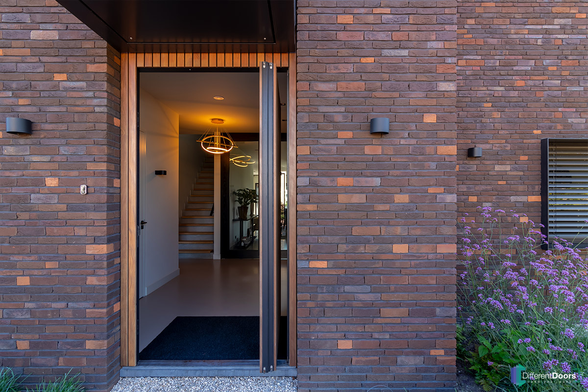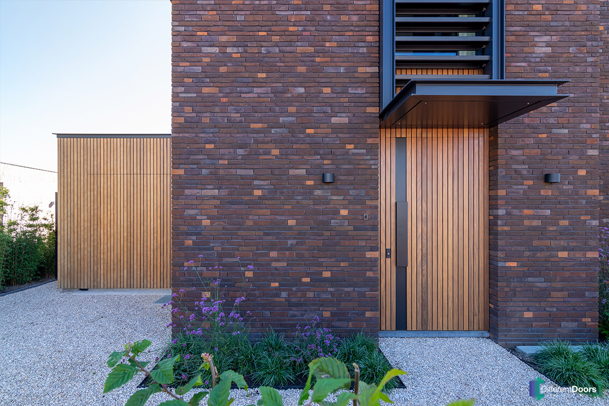 Bij een nieuwbouwwoning in Gorinchem heeft Different Doors de entree van een schitterende houten taatsdeur mogen voorzien. De pivoterende deur is gemaakt van afrormosia hout dat zich kenmerkt door zijn zichtbare vlamtekening en warme kleur. Het uitnodigende karakter van dit hout laat direct een welkome indruk achter bij gasten.