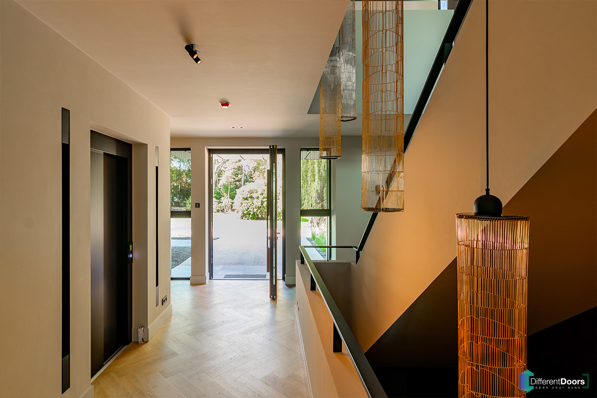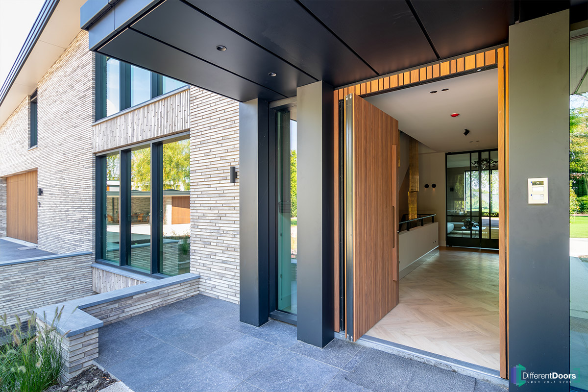 De taatsdeur is vervaardigd met het geavanceerde FritsJurgens draaisysteem en is zowel aan de binnen als buitenzijde bekleed met verticale latten. Voor het gehele project is gebruik van afrormosia hout wat zorgt voor een warme uitstraling. Met een indrukwekkende hoogte van 2,5 meter en een breedte van 1,5 meter is dit een zeer unieke en stijlvolle entree van de woning.