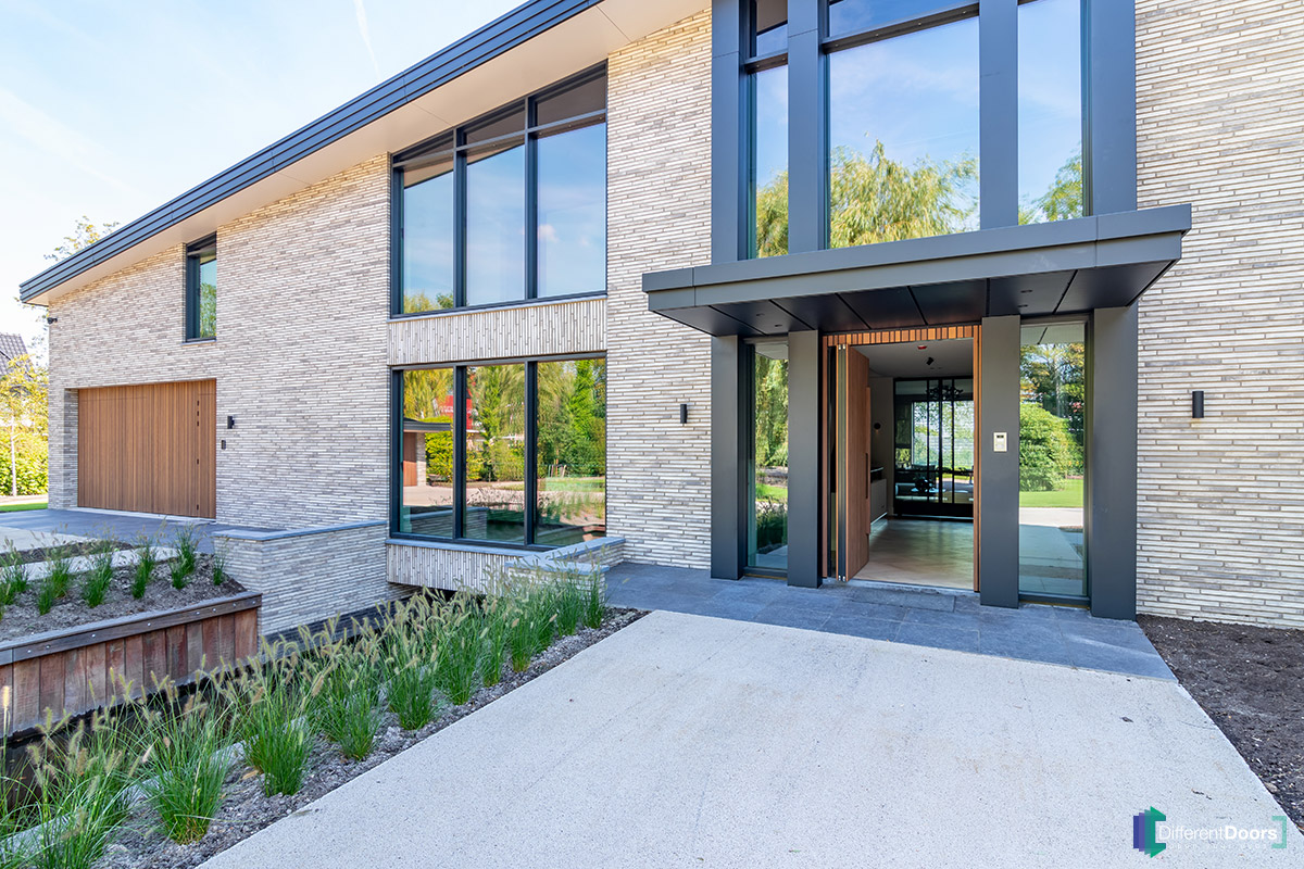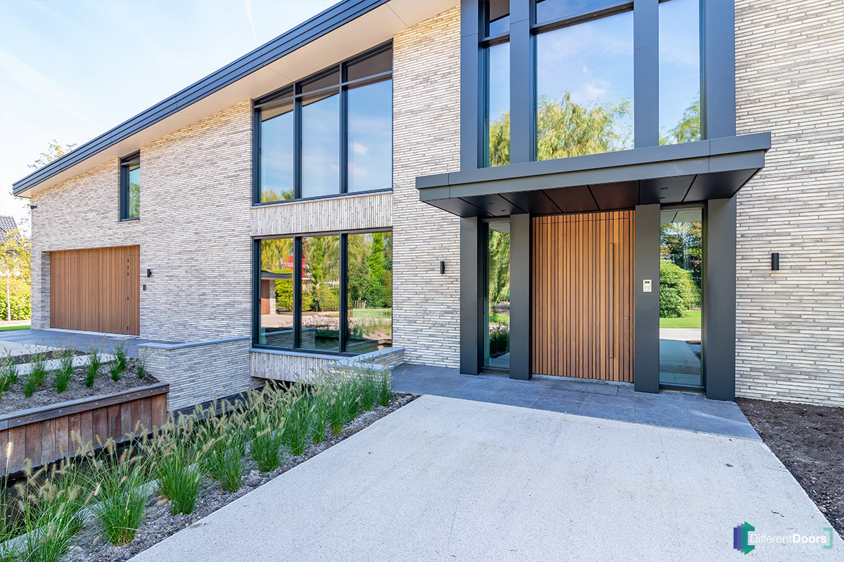 In samenwerking met Niersman Bouw heeft Different Doors een prachtige bijdrage mogen leveren aan een zeer indrukwekkende woning. Het betreft maar liefst twee houten garagedeuren gelijk in de gevel, een loopdeur gelijk in de gevel en een houten taatsdeur als voordeur. Het eindresultaat mag er zijn: vier schitterende deuren allen voorzien van dezelfde uitstraling.