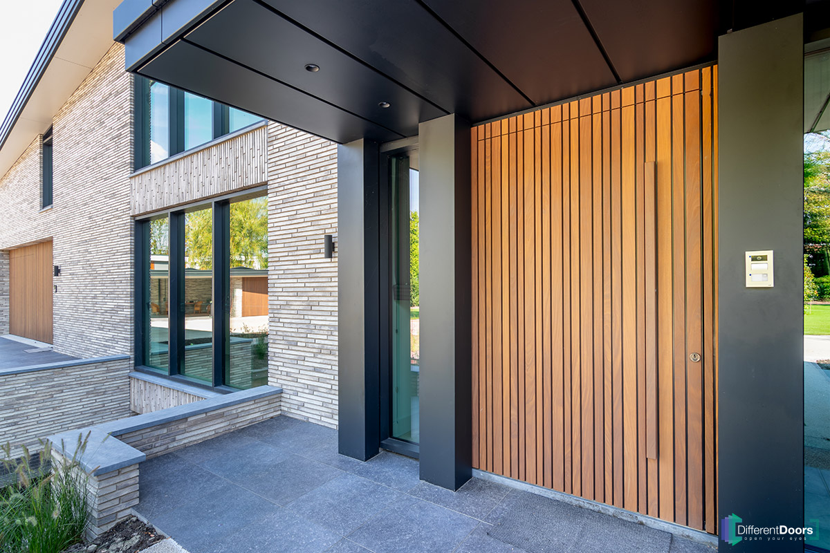 Bij dit project zijn naast de taatsdeur ook nog twee sectionaaldeuren en een loopdeur gerealiseerd. Ook deze zijn vervaardigd met verticale afrormosia houten latten. Hierdoor ontstaat er over de gehele woning een gevoel van eenheid en samenhang. De garagedeuren en loopdeur zijn gelijk met de gevel gemonteerd. Dit betekent dat de houten latten van de gevelbekleding naadloos overlopen op de houten latten van de garagedeur. Hierdoor is het in gesloten stand bijna niet te onderscheiden waar de deuren stoppen en de gevelbekleding start.