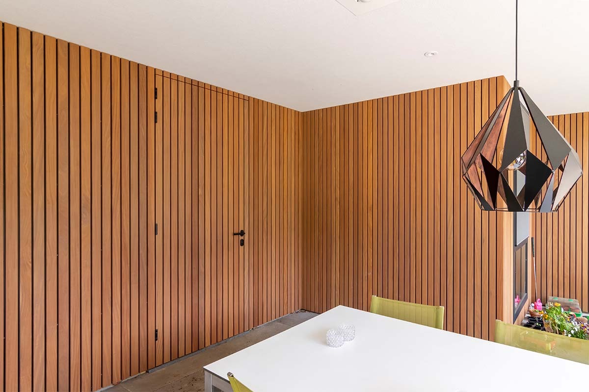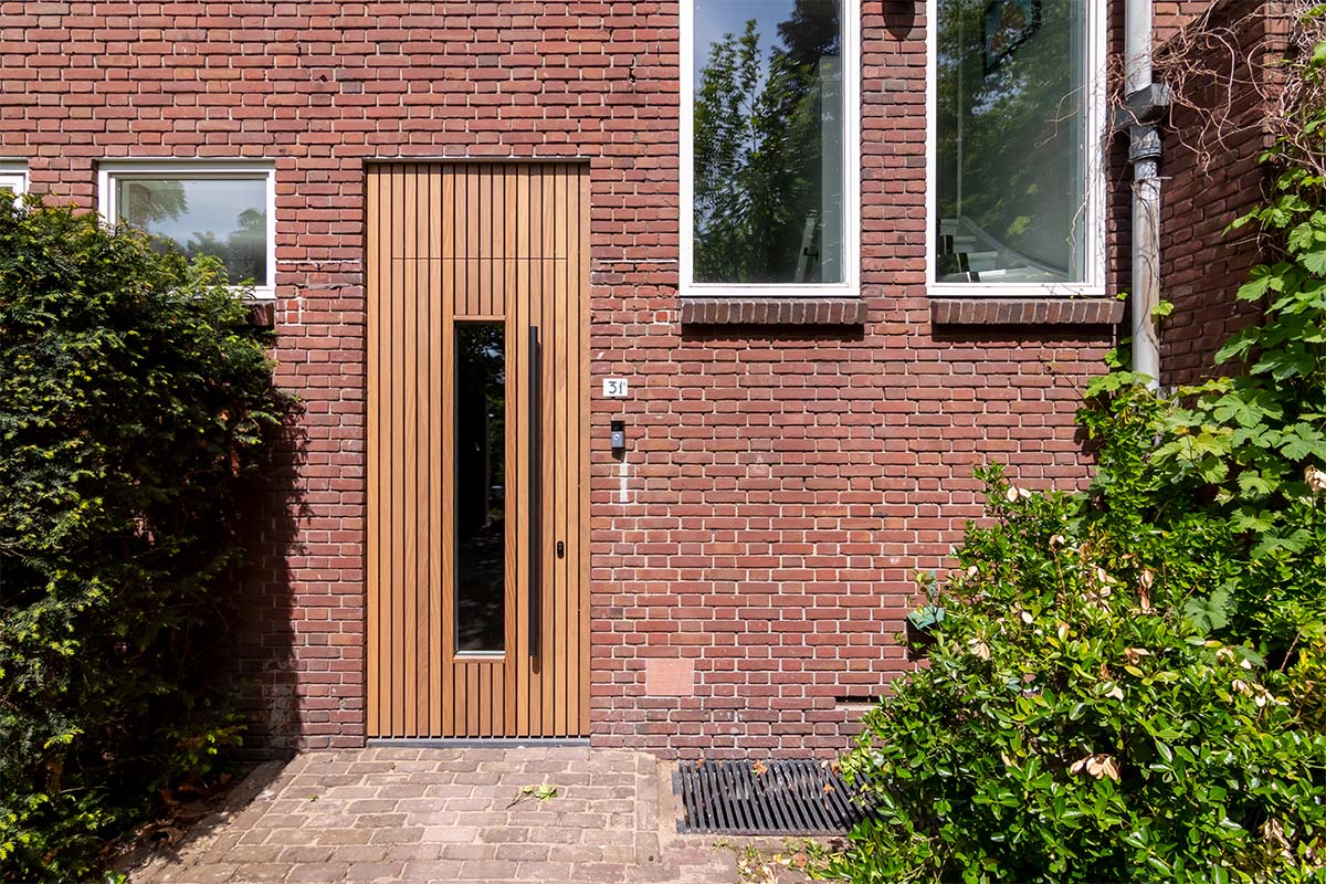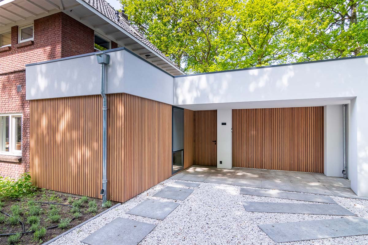 Voor deze fraaie en geheel verbouwde jaren ’30 woning heeft Different Doors een bijzondere bijdrage mogen leveren. De moderne aanbouw is voorzien van een houten zijwaartse sectionaaldeur. De Afrormosia latten geven het een stijlvolle en natuurlijke uitstraling.