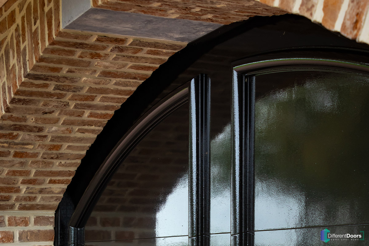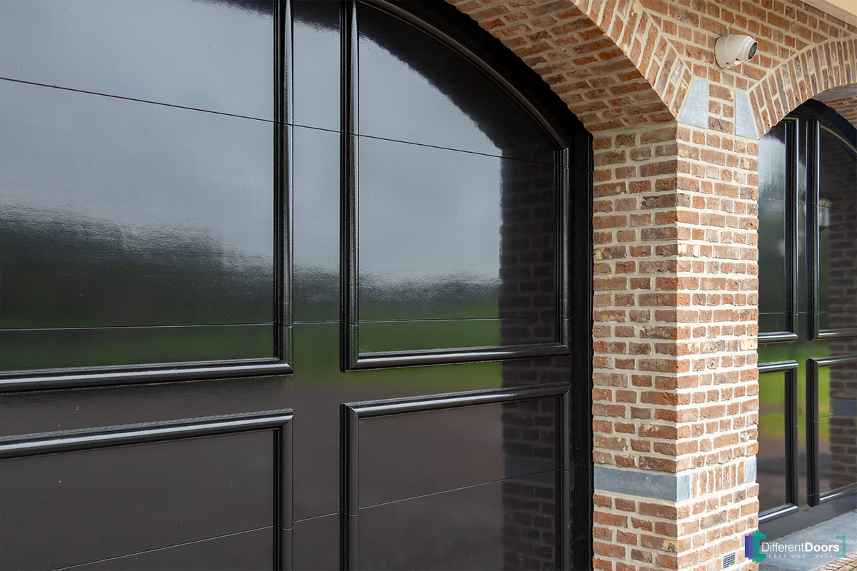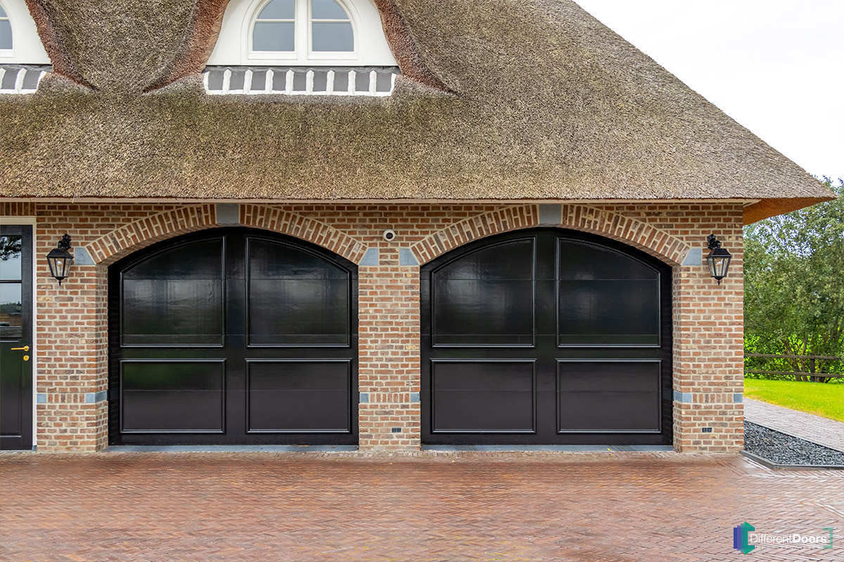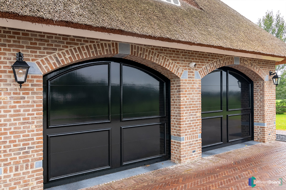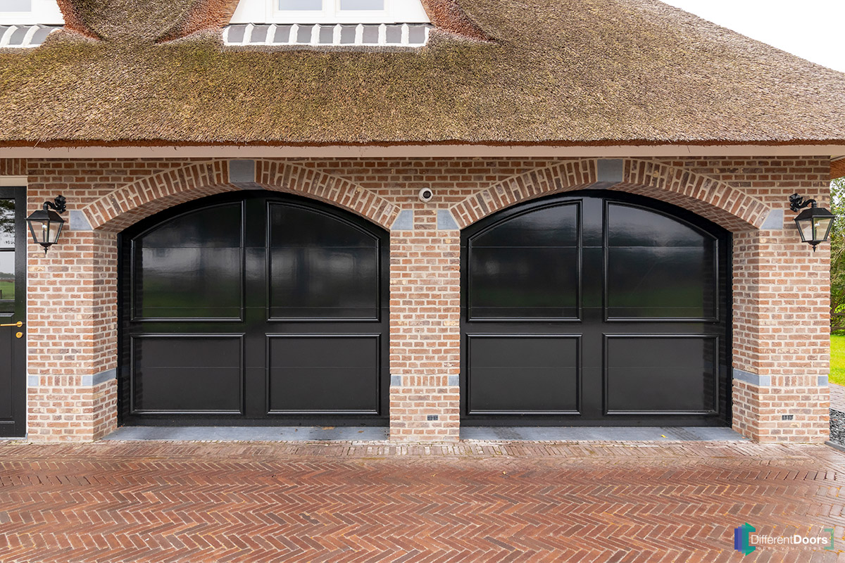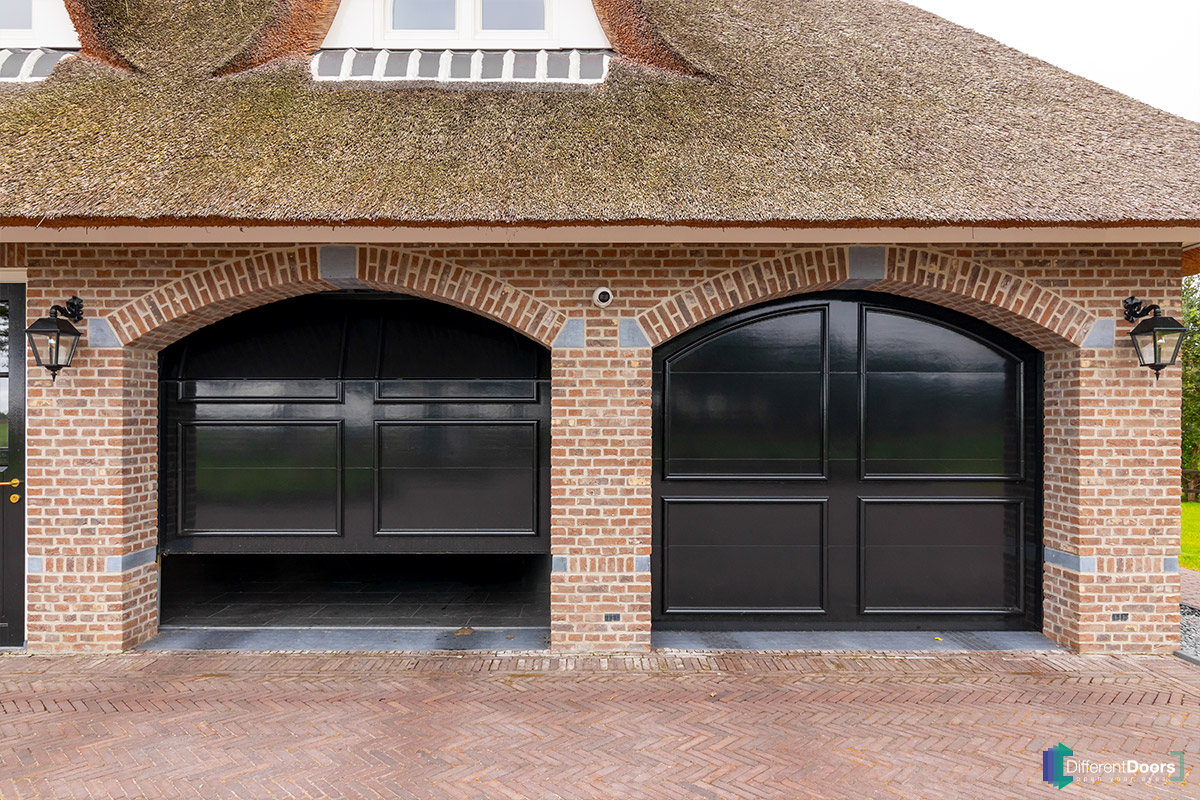 De houten garagedeuren in klassieke stijl versterken het gevoel van tijdloze elegantie wat de woning uitstraalt. Dit gevoel wordt gecreëerd door de verfijnde details en klassieke lijnen die op de deur vervaardigd zijn. De garagedeuren zijn achter de dag geplaatst, achter de getoogde muuropening, die zeer kenmerkend zijn voor traditionele woningen. Dit gitzwarte kleur (RAL9005) laat de deuren extra stralen.