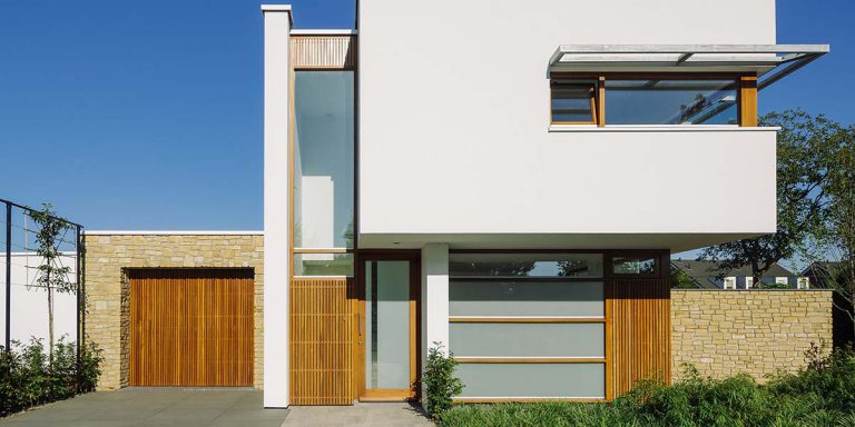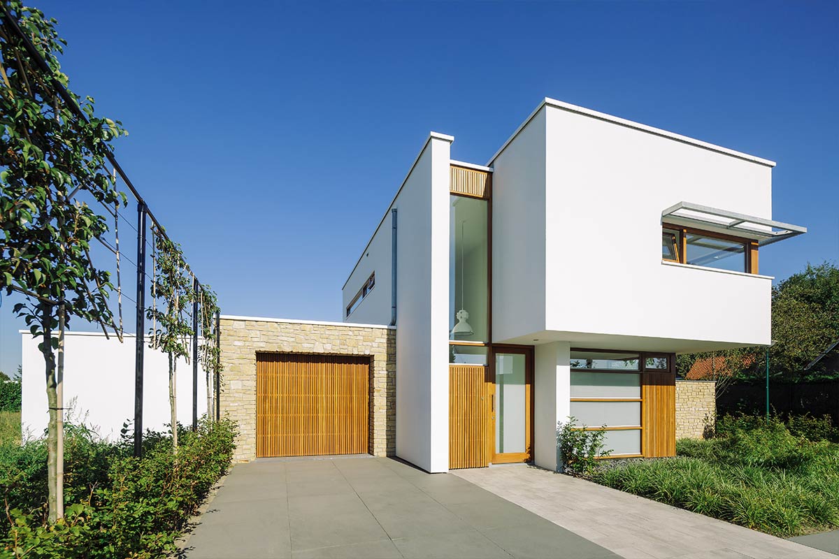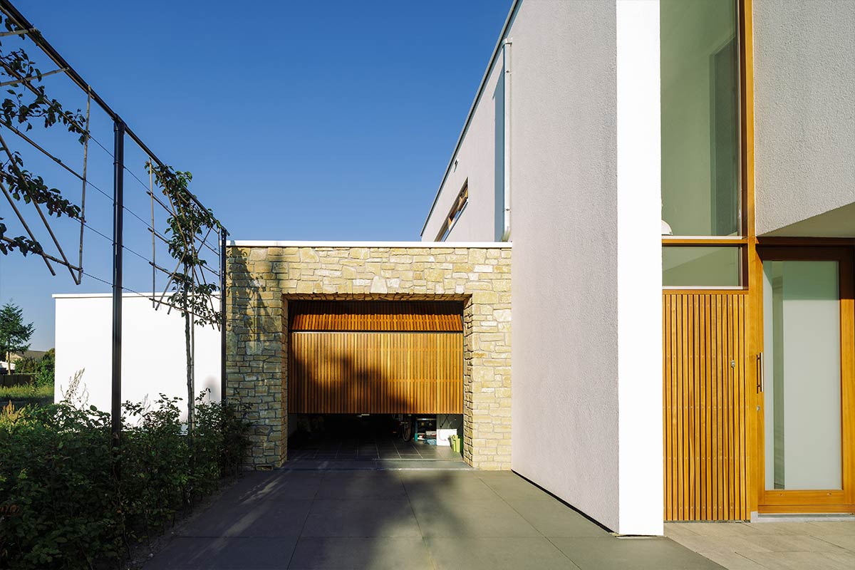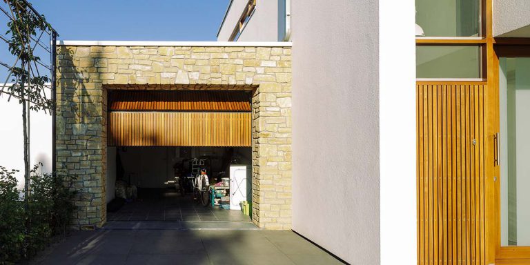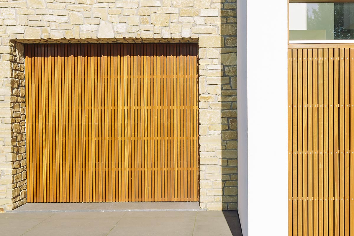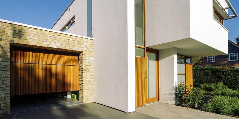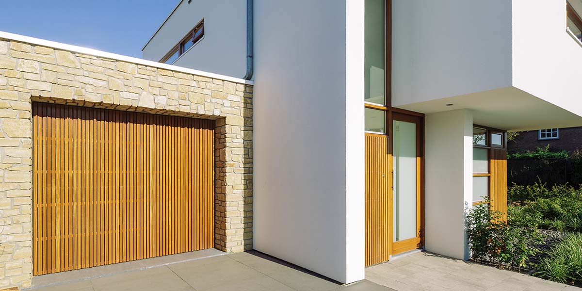 De houten garagedeur is in dezelfde stijl uitgevoerd als het huis. Een prachtig samenhangend geheel als resultaat.