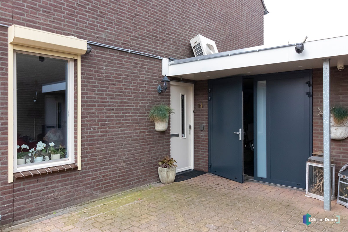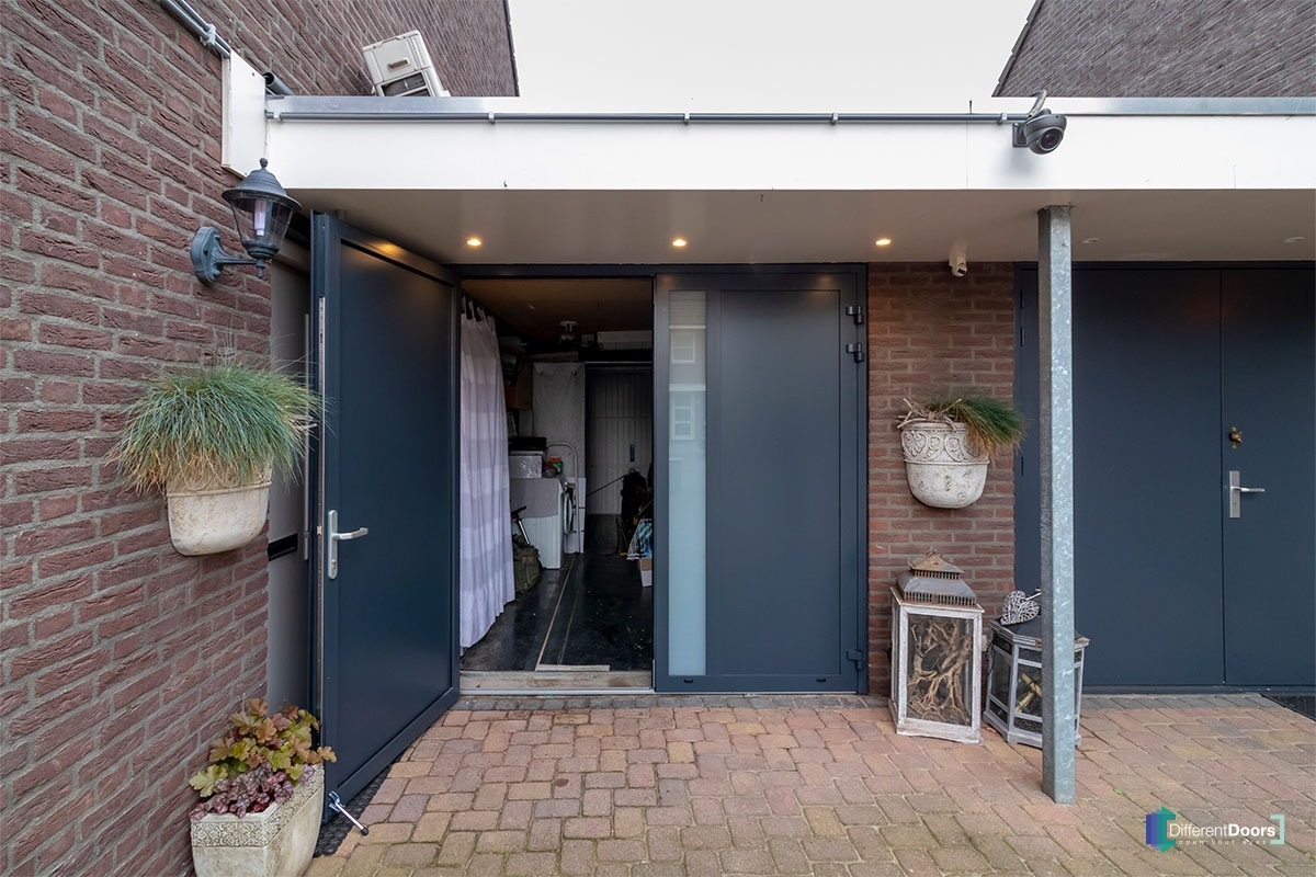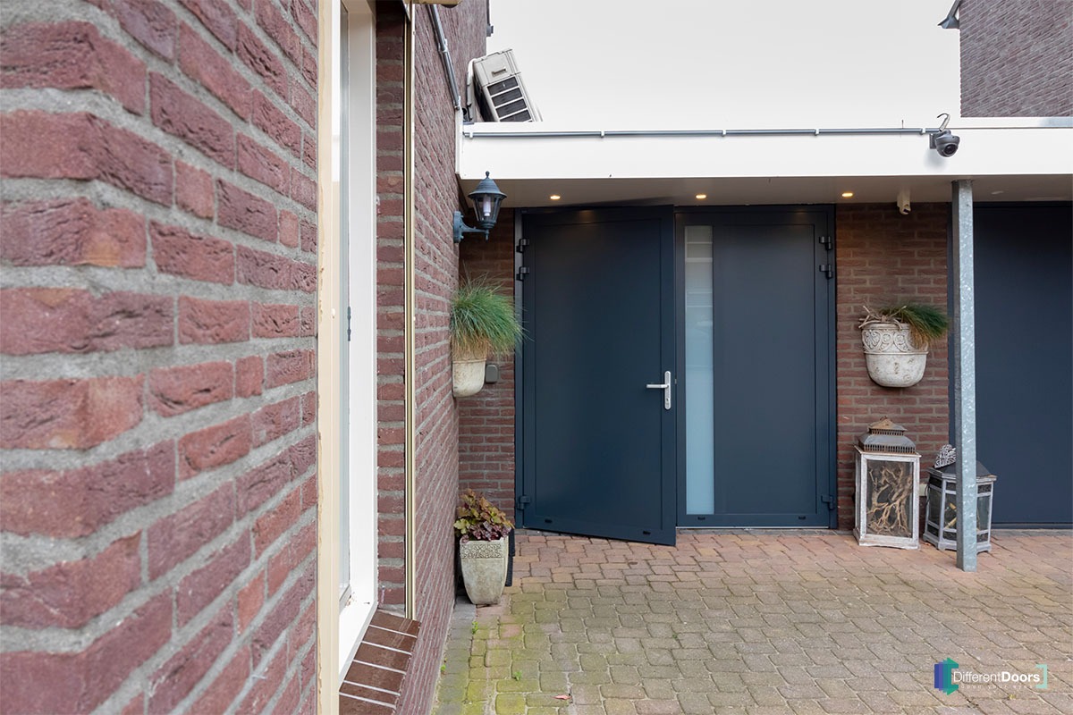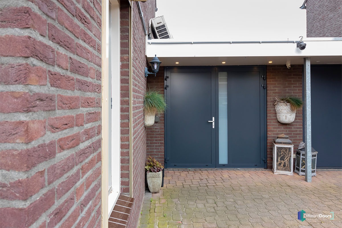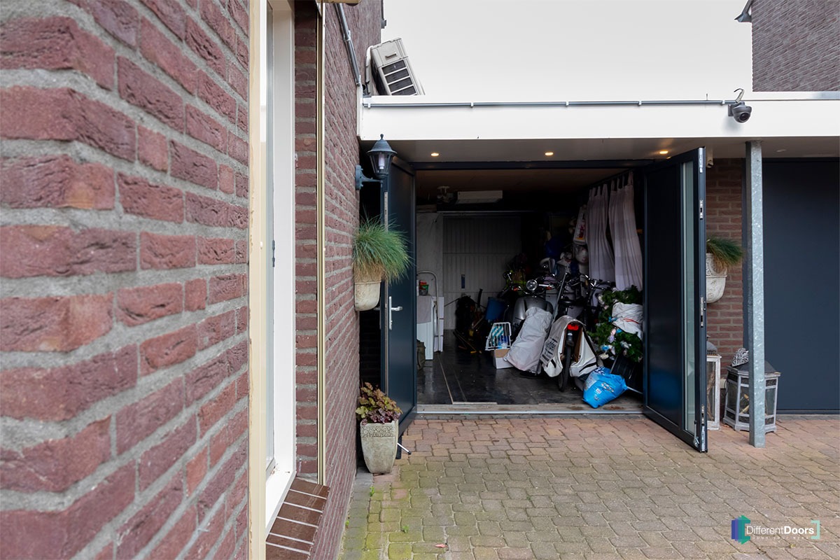 In het Limburgse Tienray heeft Different Doors strakke, moderne openslaande garagedeuren mogen plaatsen. Naar wens van de klant is één deurpaneel voorzien van verticaal melkglas. Op deze manier valt er natuurlijk daglicht de garage binnen.