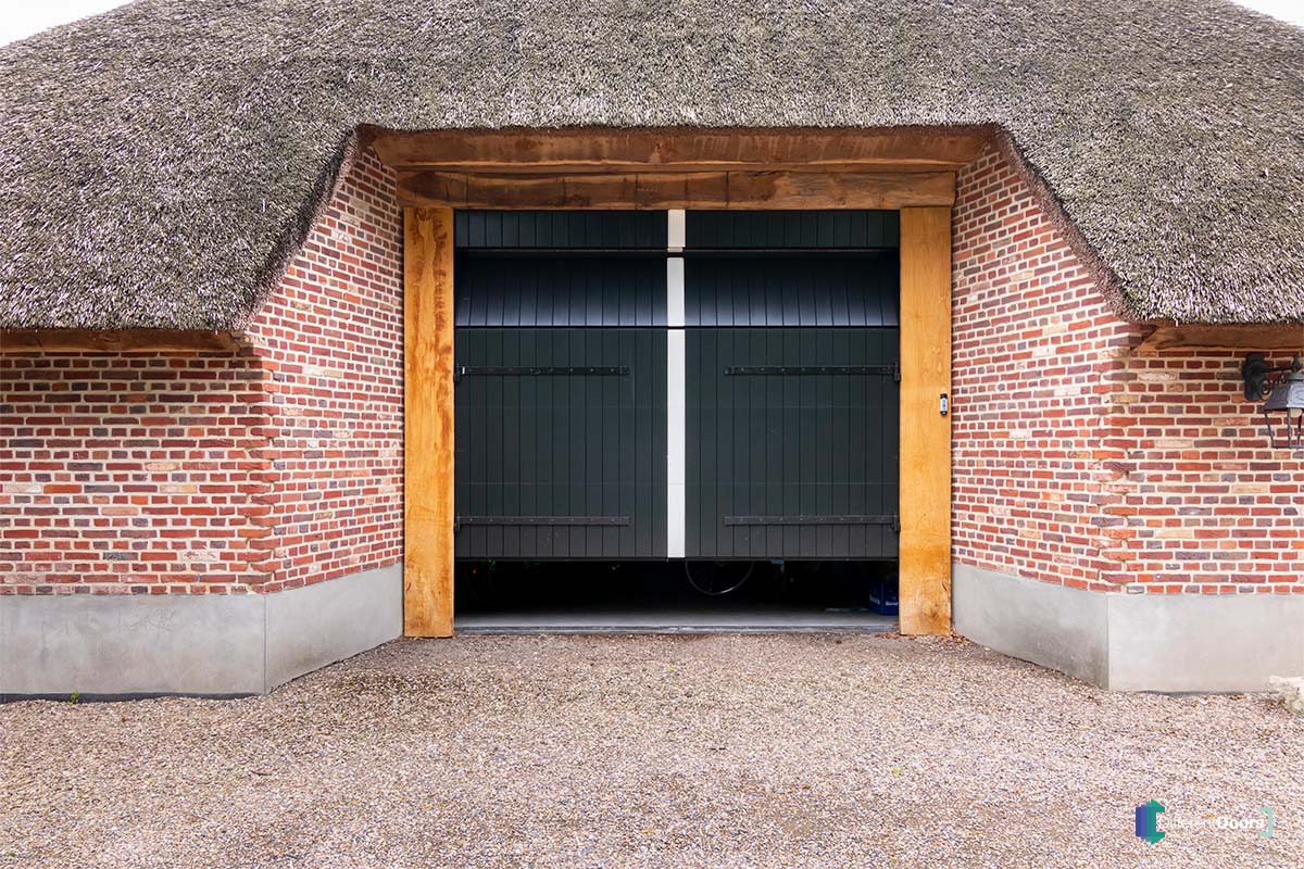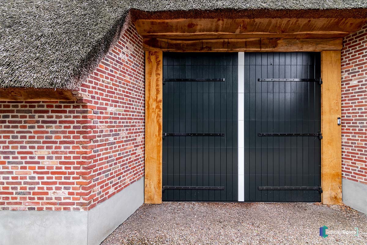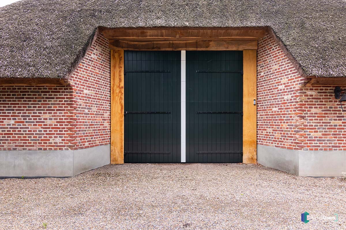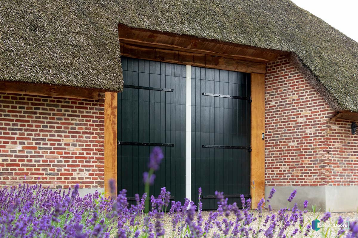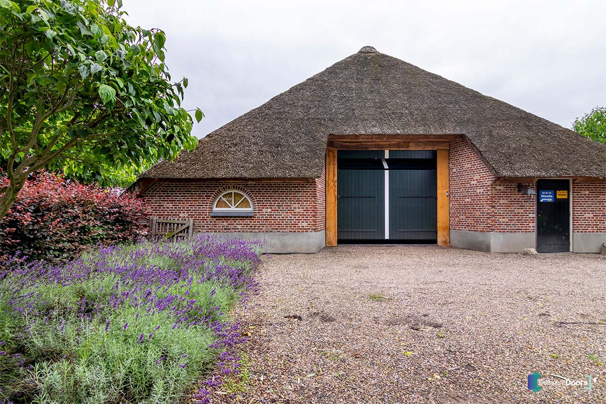 Bij deze mooie boerderijschuur met rietgedekte kap heeft Different Doors een bijzonder fraaie houten garagedeur mogen plaatsen. Om de houten garagedeur aan te laten sluiten op de landelijke uitstraling die bij een boerderij hoort is ervoor gekozen om een openslaande garagedeur uit te voeren als houten sectionaaldeur. De grote, openslaande deuren zijn namelijk al jaren kenmerkend voor boerderijen.