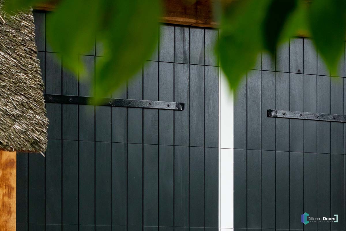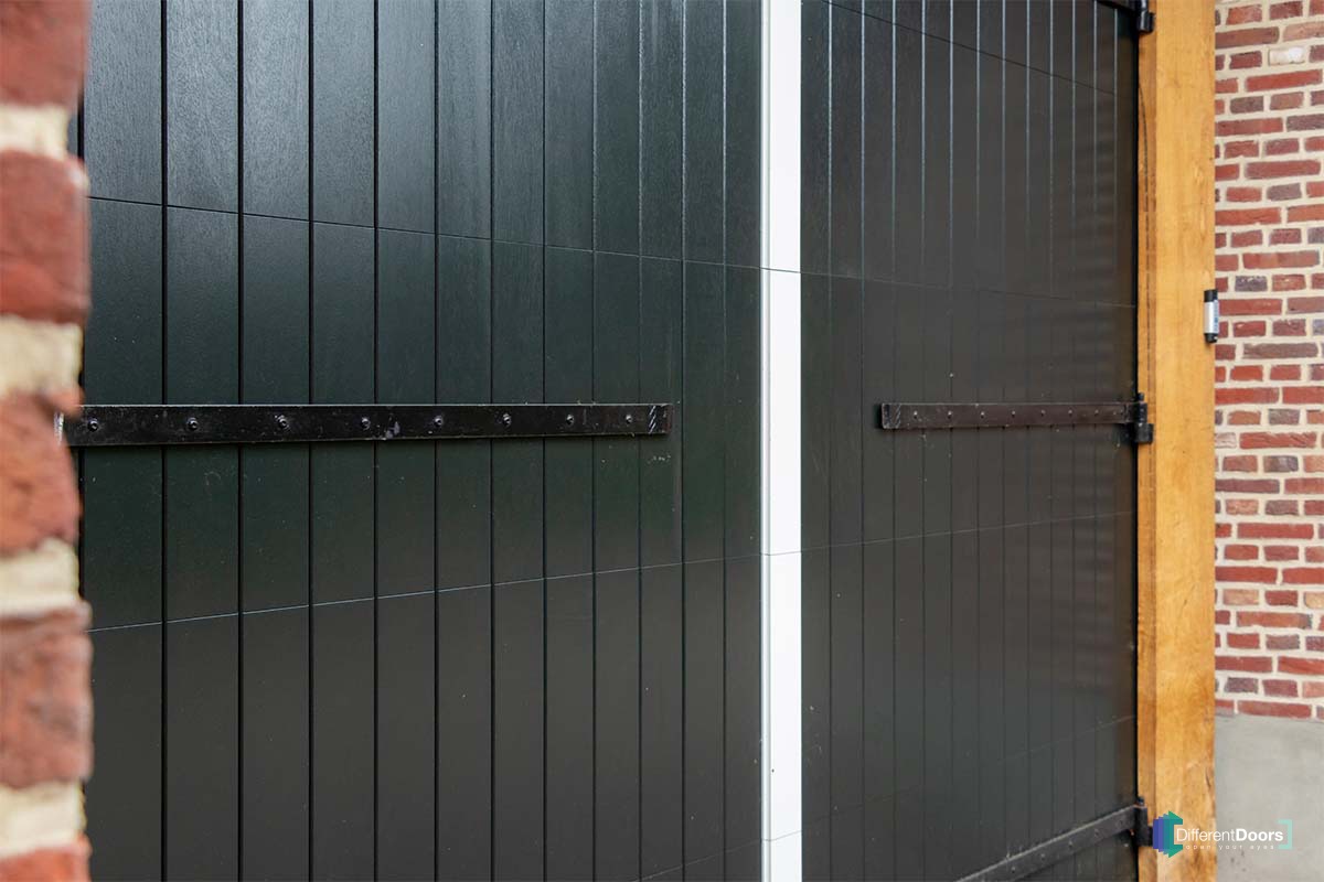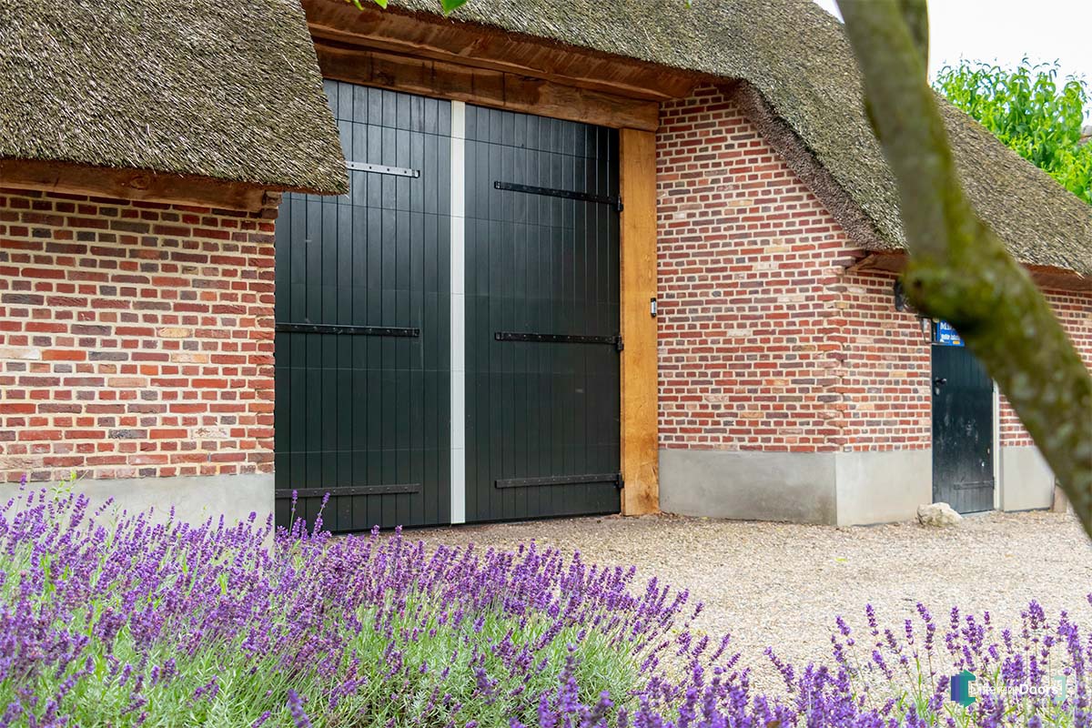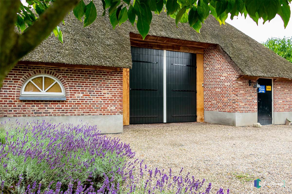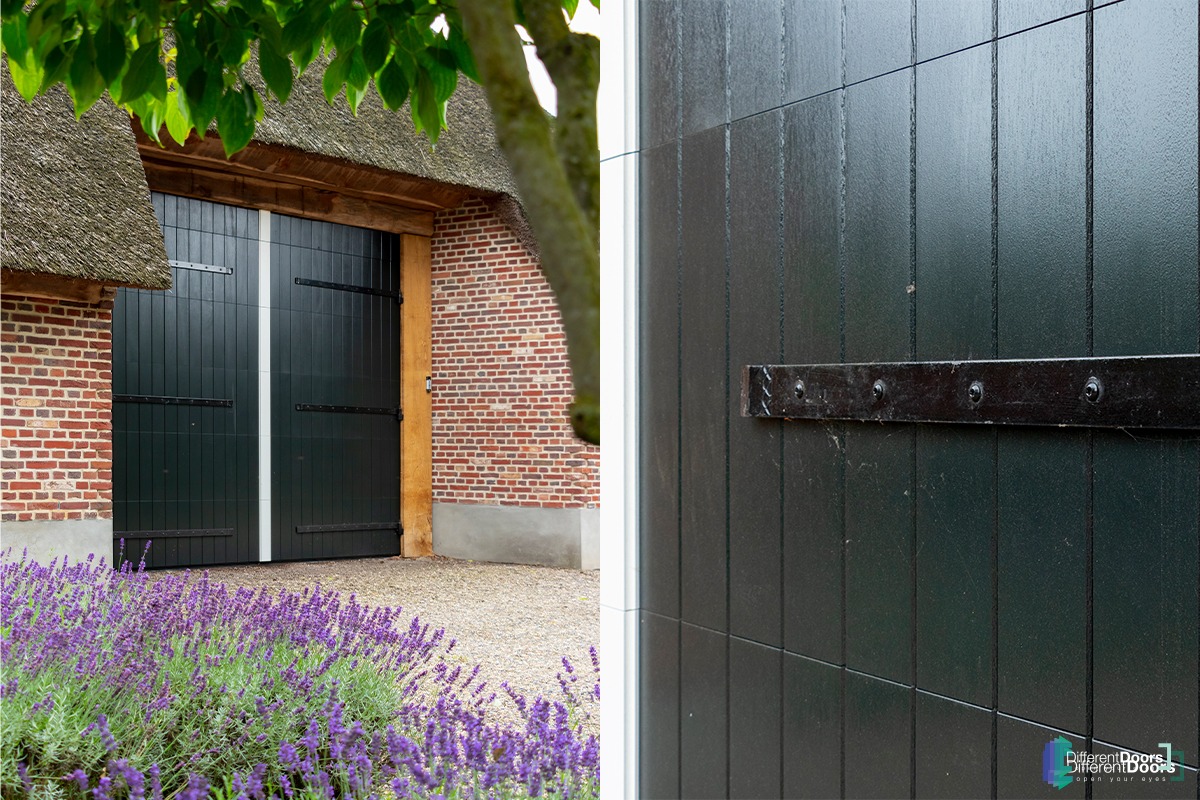 Bij deze mooie boerderijschuur met rietgedekte kap heeft Different Doors een bijzonder fraaie houten garagedeur mogen plaatsen. Om de houten garagedeur aan te laten sluiten op de landelijke uitstraling die bij een boerderij hoort is ervoor gekozen om een openslaande garagedeur uit te voeren als houten sectionaaldeur. De grote, openslaande deuren zijn namelijk al jaren kenmerkend voor boerderijen.