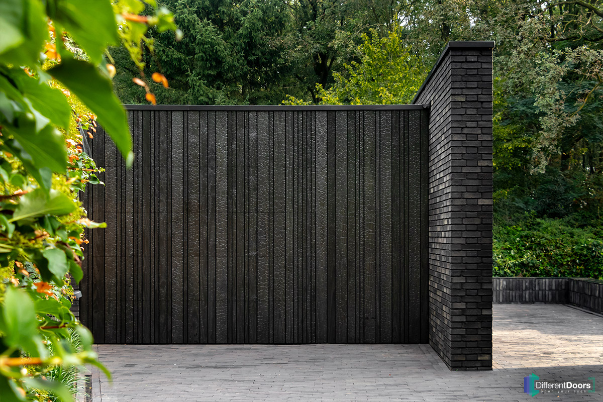 Het type hout dat gebruikt is voor dit project maakt het een garagedeur uniek in zijn soort. Maar niet alleen het type hout zorgt ervoor dat deze garagedeur het omkijken waard is, ook de manier waarop deze naadloos geïntegreerd is in de gevel. Dit is een van de specialiteiten van Different Doors. Bij het passeren van de garage oogt de garage als één houten gevel, waar er in realiteit een garagedeur verscholen gaat. Doordat iedere plank door de Shou Sugi Ban techniek uniek is, én er gebruik is gemaakt van houten latten van verschillende breedtes oogt de gevel speels, maar tegelijkertijd strak door de donkere kleur.