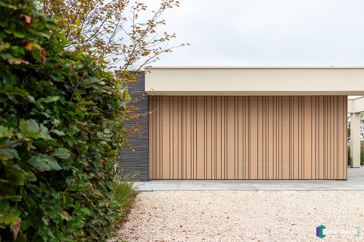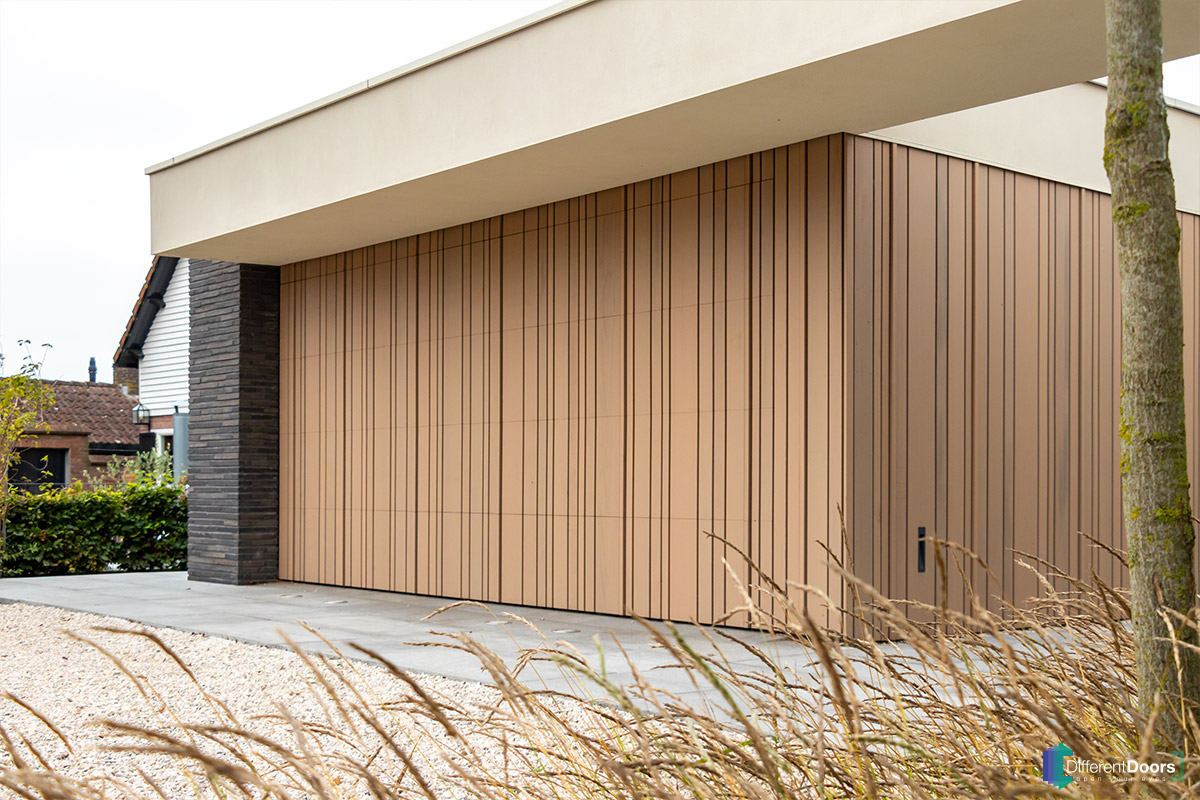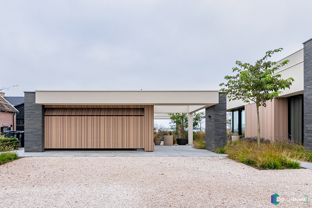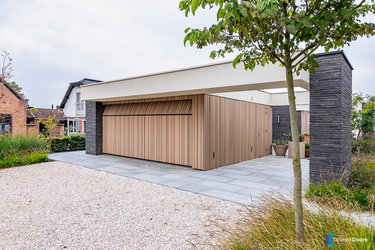 De garagedeur is zo uitgevoerd dat deze onzichtbaar in de gevel verwerkt is. De houten latten van de garagedeur stroken perfect door op de houten latten van de gevelbekleding. Hierdoor is het moeilijk te onderscheiden waar de garagedeur zich bevindt, en waar deze overgaat in de gevel. Dit vormt een van de specialiteiten van Different Doors en maakt onze garagedeuren uniek in Nederland.