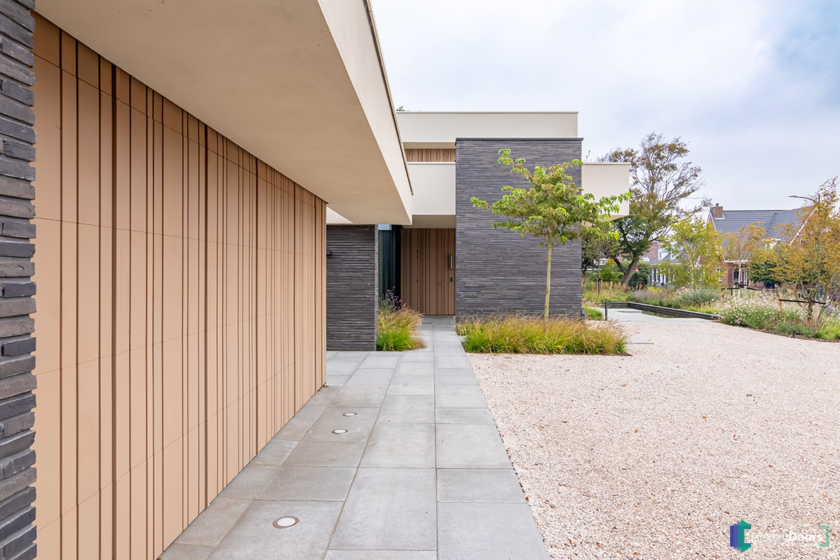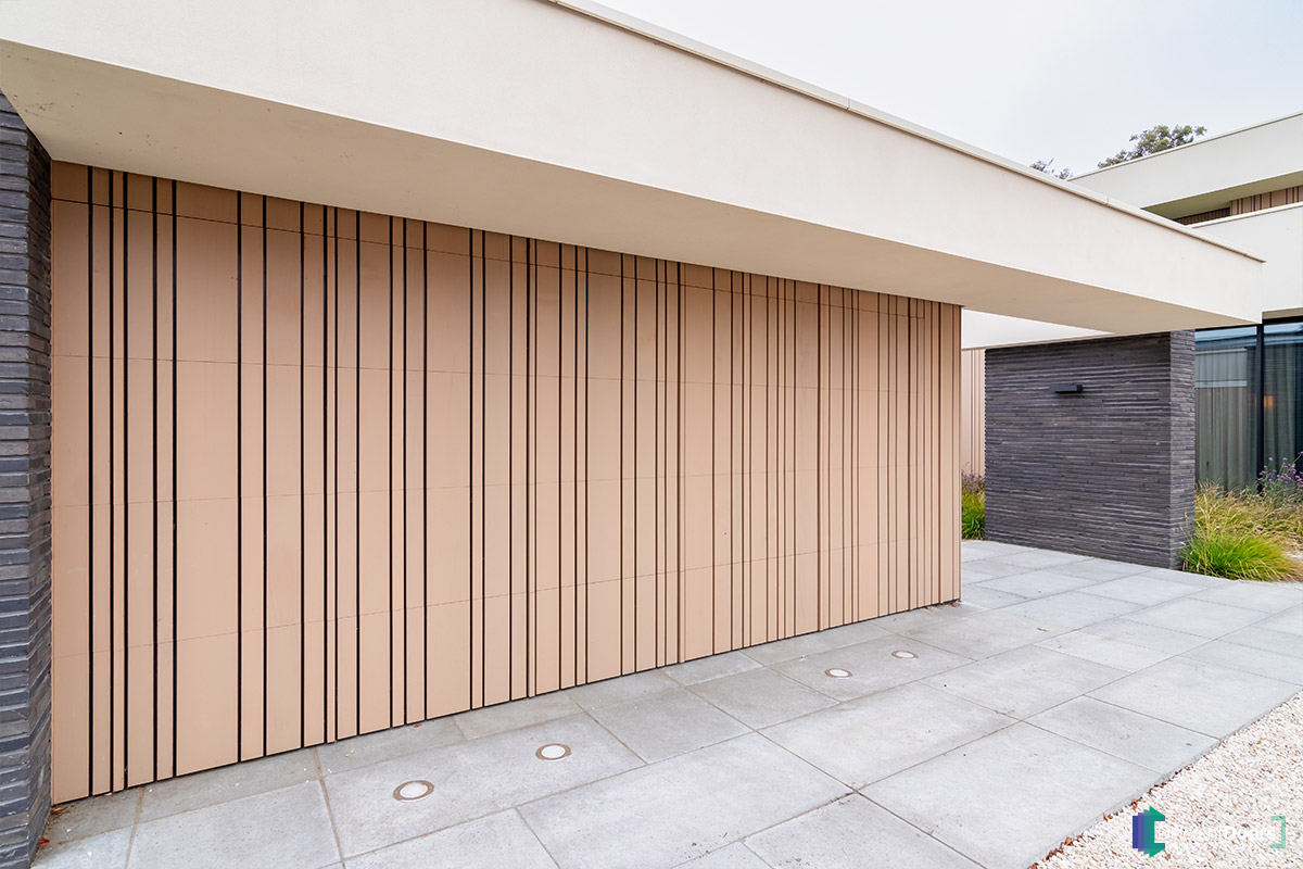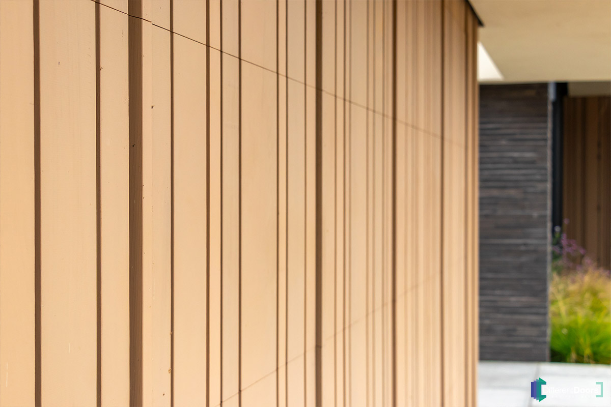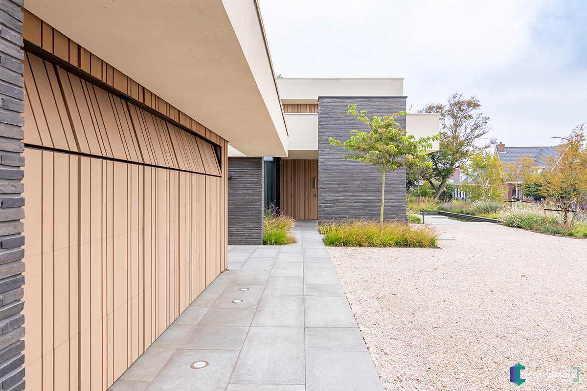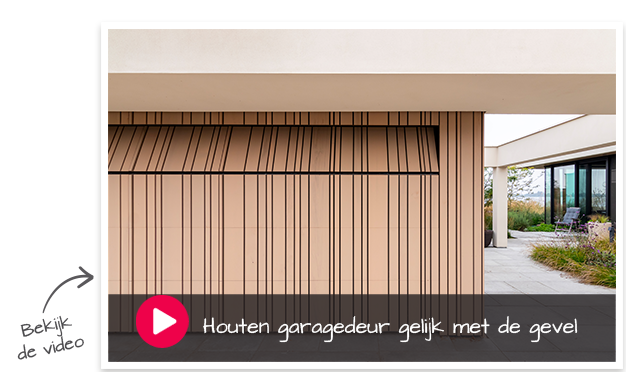 De garagedeur is zo uitgevoerd dat deze onzichtbaar in de gevel verwerkt is. De houten latten van de garagedeur stroken perfect door op de houten latten van de gevelbekleding. Hierdoor is het moeilijk te onderscheiden waar de garagedeur zich bevindt, en waar deze overgaat in de gevel. Dit vormt een van de specialiteiten van Different Doors en maakt onze garagedeuren uniek in Nederland.