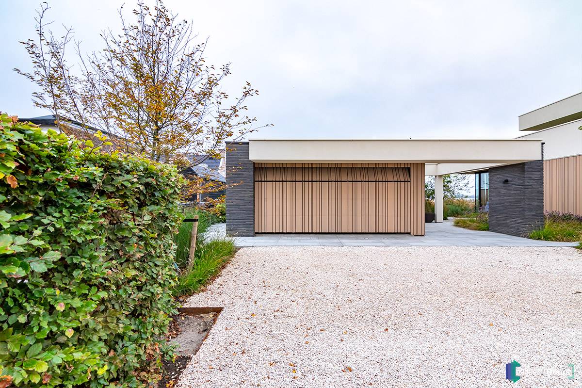 Bij een nieuwbouwwoning hebben we een prachtige houten sectionaaldeur gelijk met de gevel mogen plaatsen. De garagedeur is vervaardigd uit hetzelfde hout als dat is gebruikt voor de overige houten elementen van de woning. Hierdoor matcht de garagedeur qua uitstraling perfect met de rest van het huis.