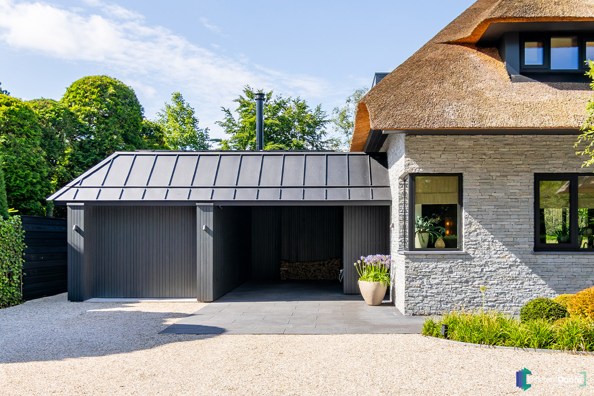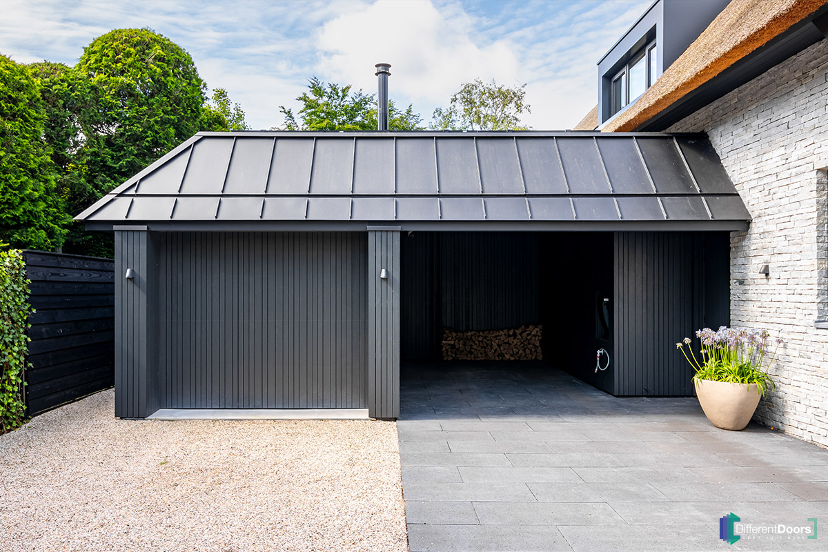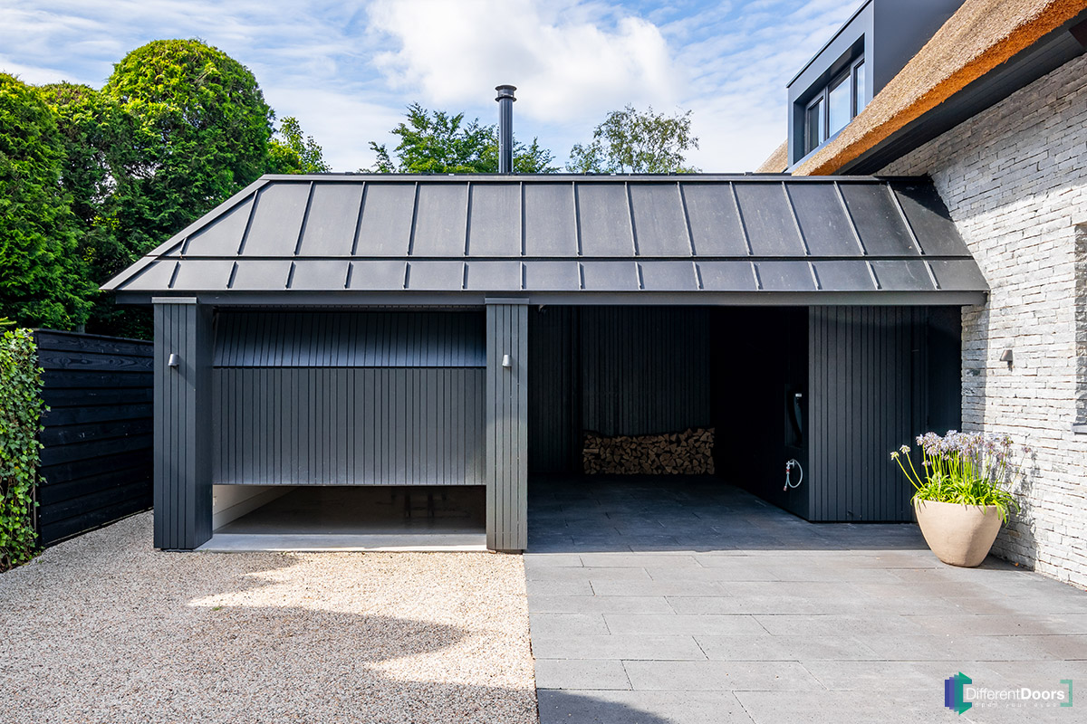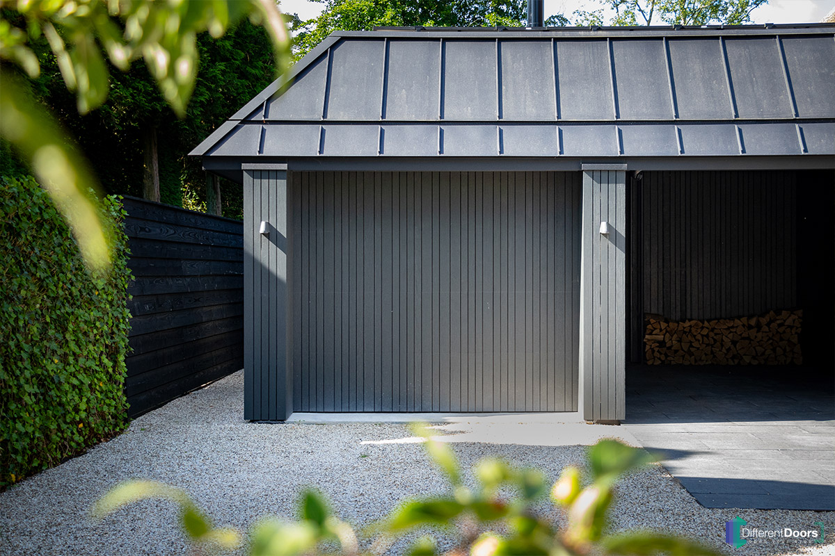 De garagedeur is achter de dag geplaatst en voorzien van verticale latten, wat zorgt voor een strak en modern lijnenspel. Dit project is een goed voorbeeld van de maatwerk garagedeuren van Different Doors. In samenspraak met de architect en het bouwbedrijf is er een garagedeur gecreëerd die perfect aansluit bij de uitstraling van de rest van de garage en woning.