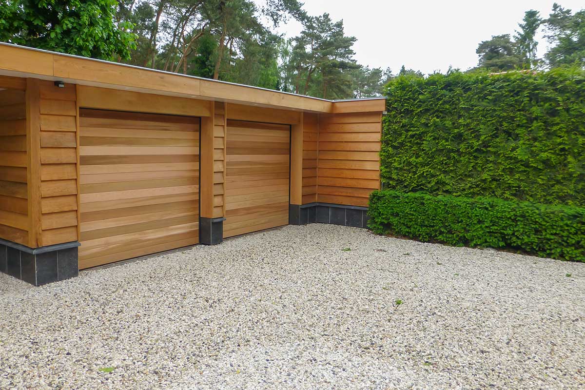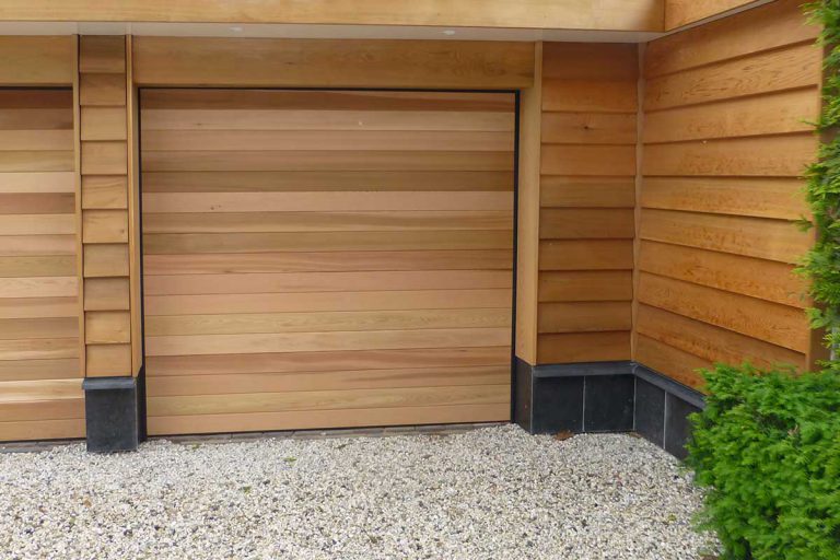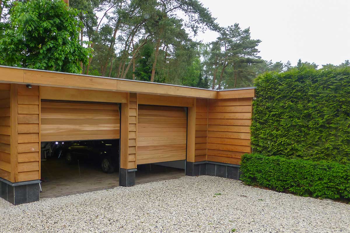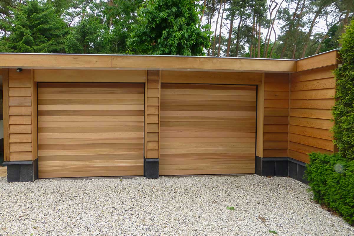 In Bosch en Duin (Utrecht) monteerde Different Doors twee houten sectionaaldeuren. De houten garagedeuren zijn bekleed met de houtsoort Red Cedar en zijn niet behandeld. De houten sectionaalpoorten vormen een mooi geheel met de gepotdekselde betimmering rondom de deuren.